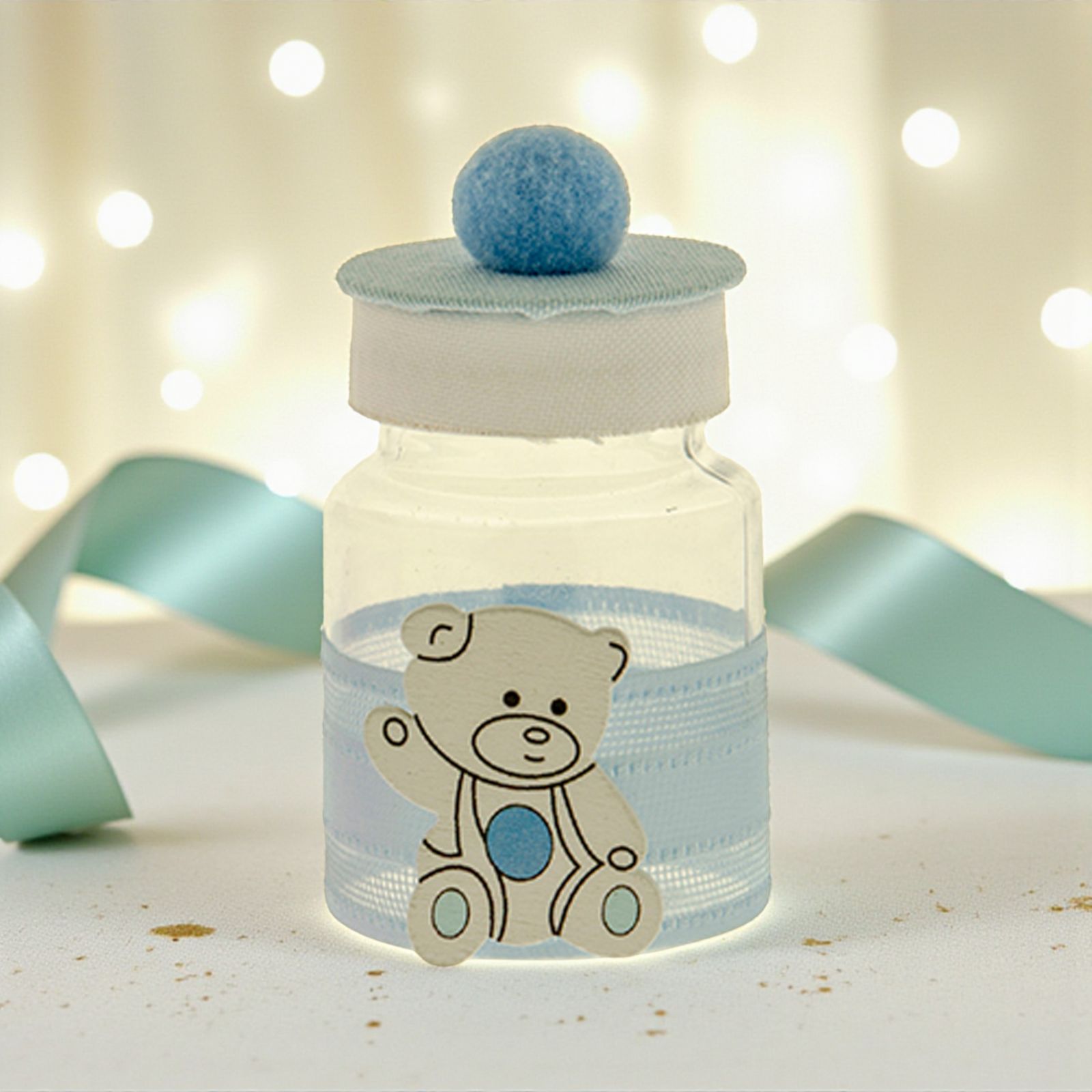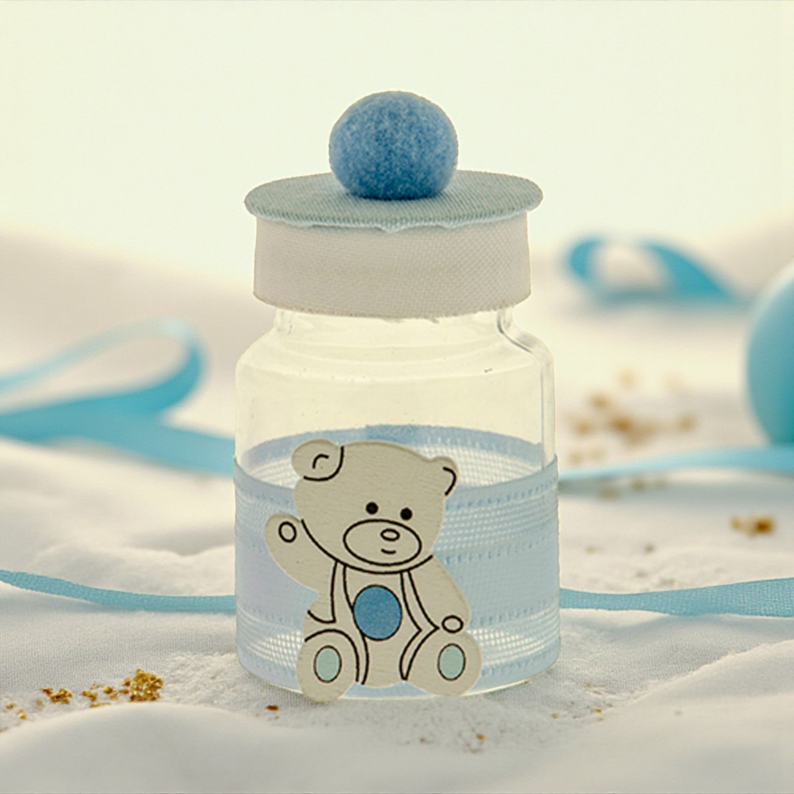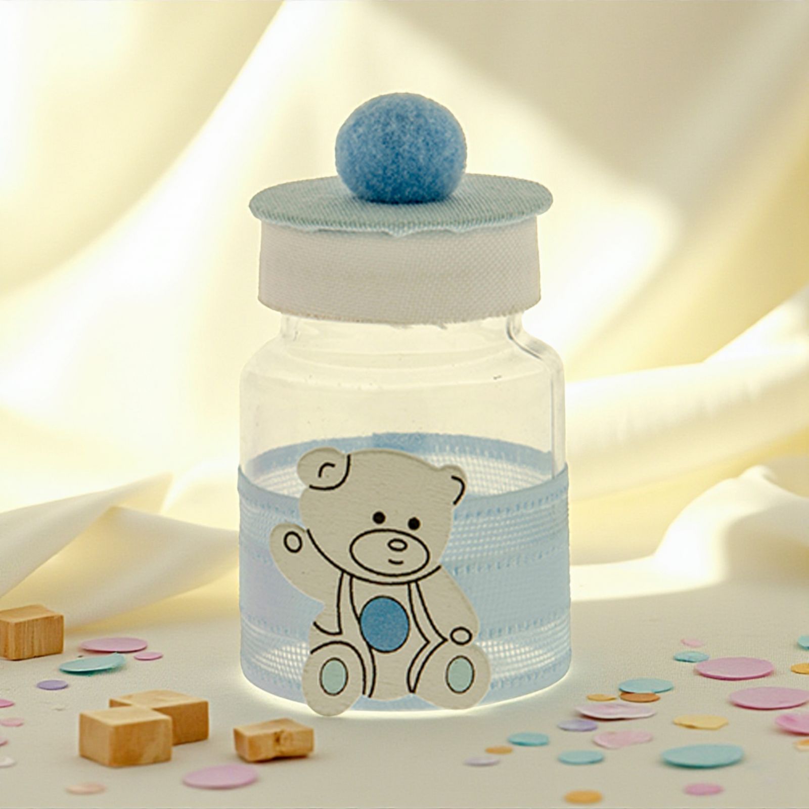 Dolci e simpatici mini biberon portaconfetti con dettagli celesti e pon pon sul tappo, arricchiti da un tenero orsetto con nastro celeste sul dorso.