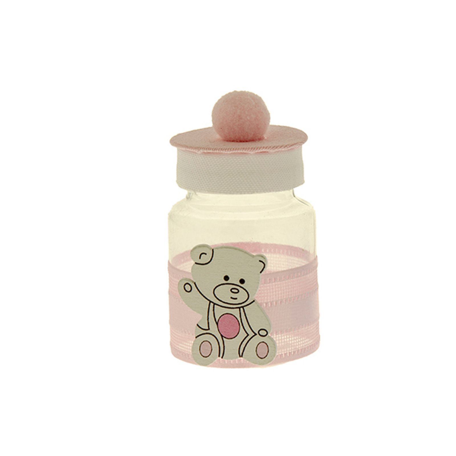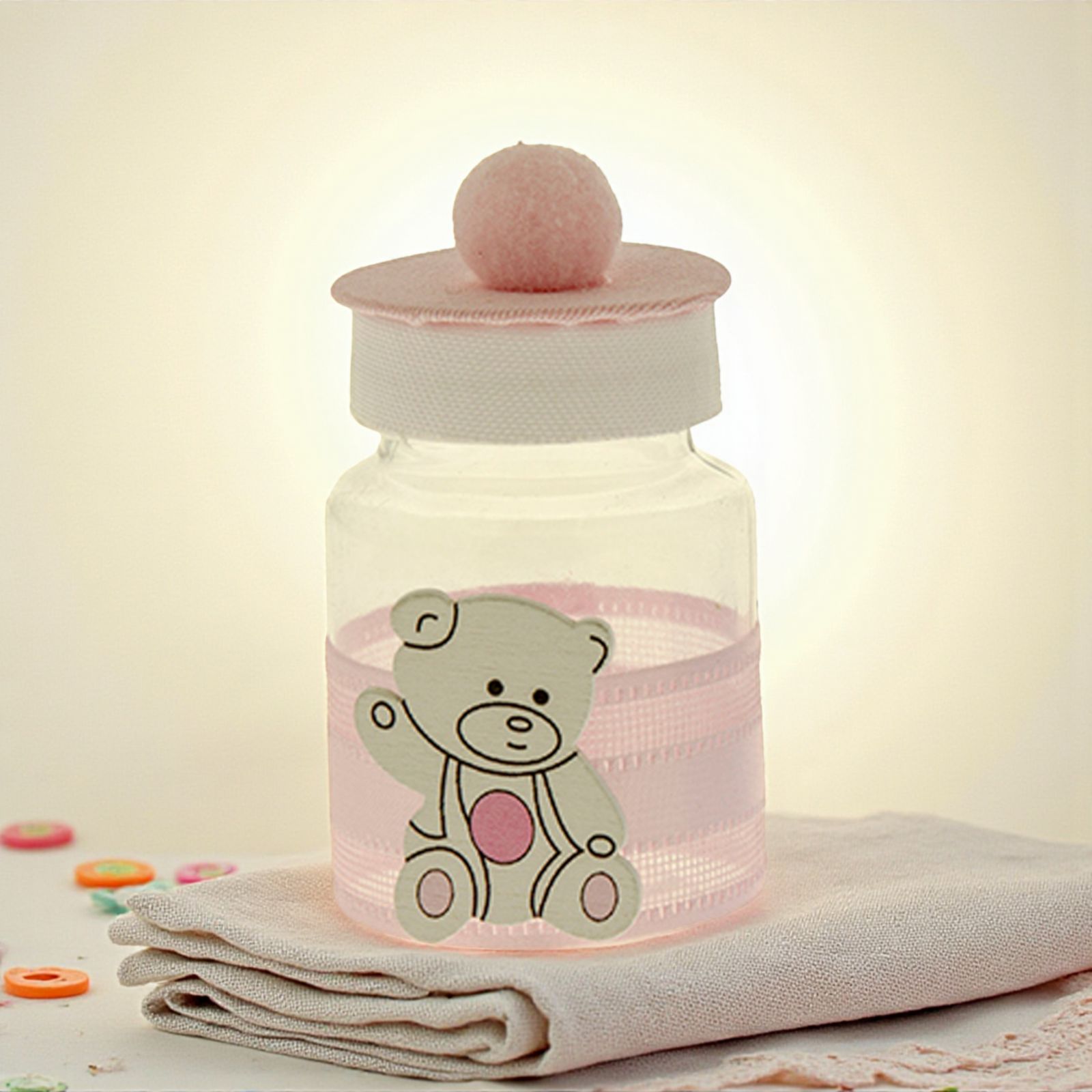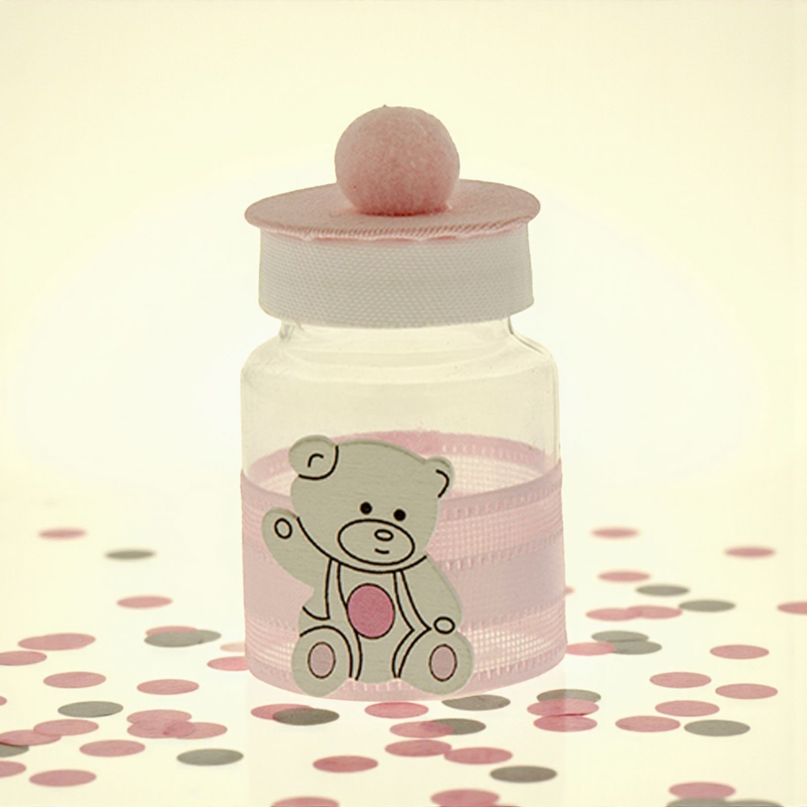 Portaconfetti a forma di biberon trasparente con pon pon rosa sul coperchio e piccolo orsetto sulla parte frontale.
