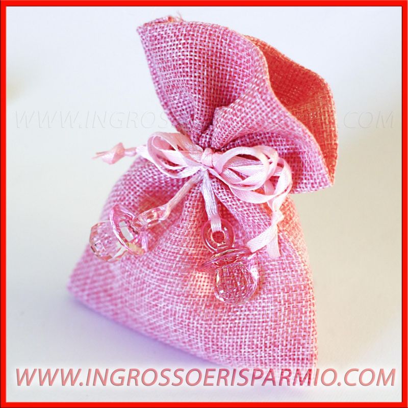 Sacchettini Juta per confetti con ciuccetti rosa per bomboniere nascita primo compleanno o battesimo per bimba economici ed originali!!!