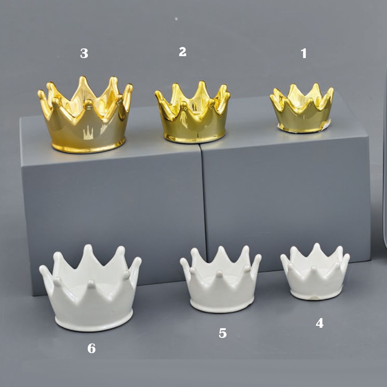 Scegli le nostre coppette a forma di corona, disponibili in due finiture: oro e bianco e in tre dimensioni differenti per accontentare tutte le esigenze!