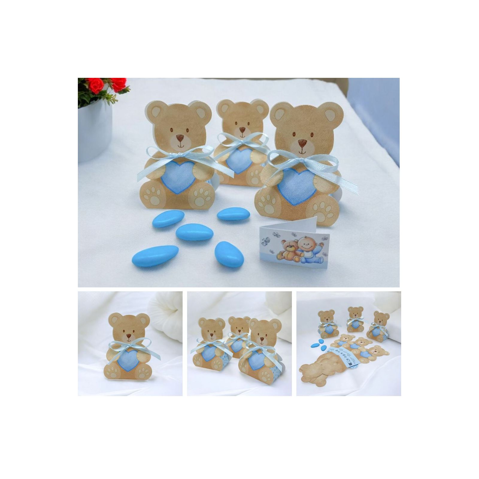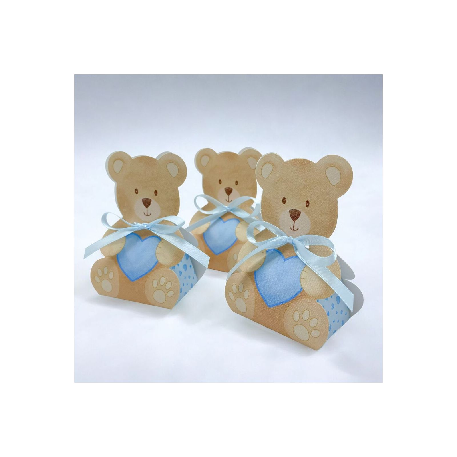 Le caratteristiche distintive di questa scatolina includono uno sfondo celeste con cuoricini azzurri sui laterali e un tenero orsetto che tiene fra le mani un cuore azzurro. Il nastrino con fiocco, che collega delicatamente le due facce dell'orsetto, può essere scelto separatamente per personalizzare ulteriormente la tua bomboniera.