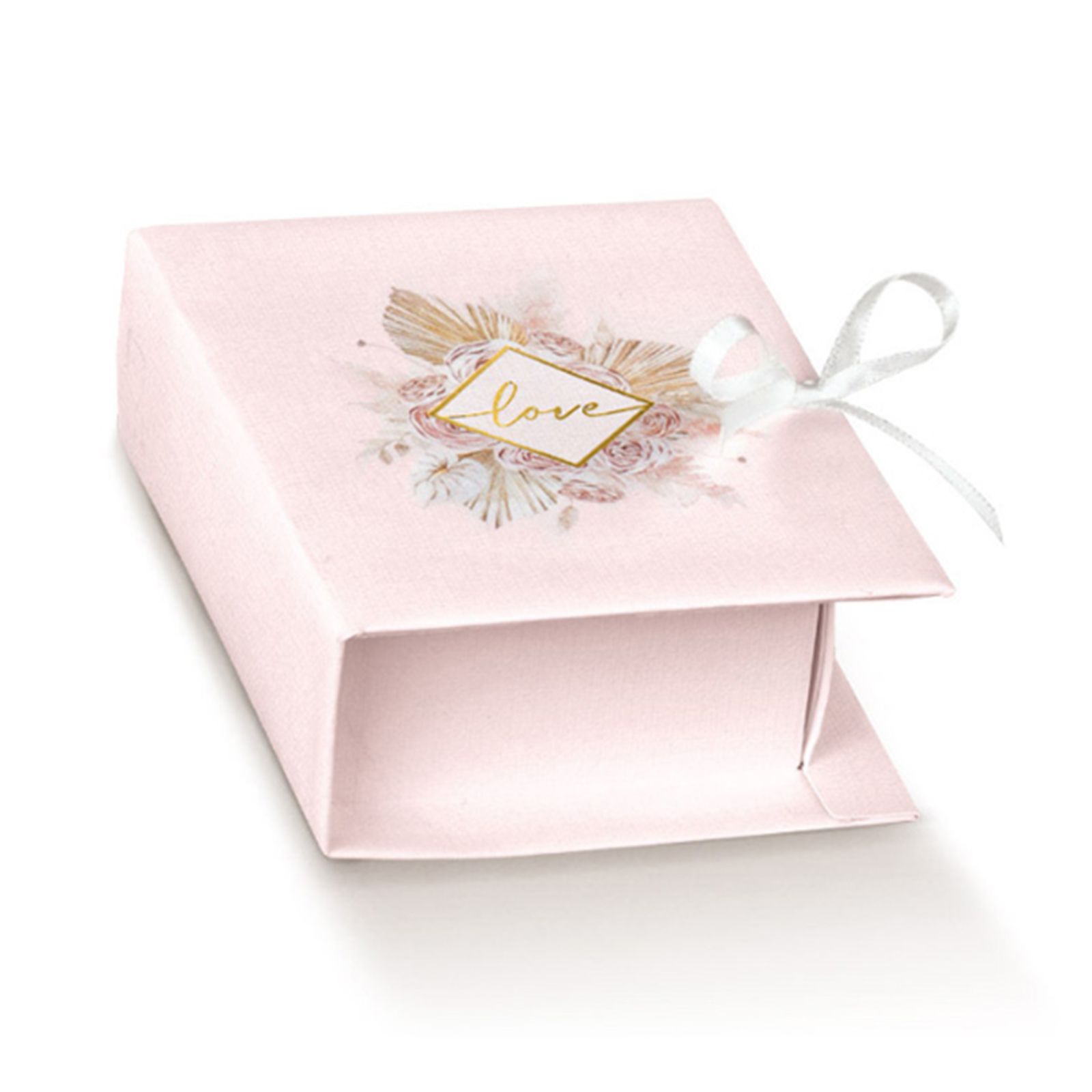 Rendi il tuo matrimonio ancora più speciale con il nostro raffinato libro portaconfetti. Realizzato con cura utilizzando cartoncino rosa, questa scatolina a forma di libro è un simbolo di amore e romanticismo, completa di foro per l'aggiunta del fiocco. Il suo design elegante e delicato cattura l'attenzione con la scritta "Love" dorata all'interno di un rombo circondato da fiori e palme. Questi dettagli floreali aggiungono un tocco di bellezza e gioia al tuo matrimonio.