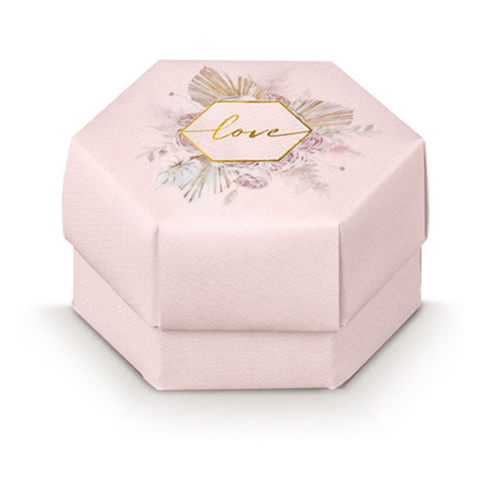 Realizzata con cura e attenzione ai dettagli, questo porta confetti è il regalo perfetto per i tuoi ospiti. Realizzata in cartoncino rosa pastello e suddivisa da scomparti interni, questa scatolina ha una forma esagonale che la rende davvero speciale. Il coperchio è decorato con la scritta "Love" in elegante color oro e una delicata decorazione floreale, che aggiunge un tocco di grazia e raffinatezza.