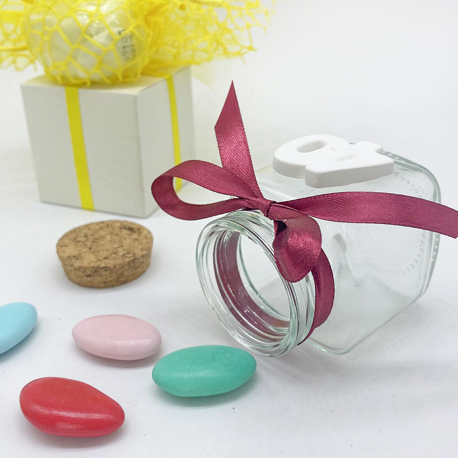Realizzato in vetro di alta qualità e dotato di un tappo in sughero, il vasetto portaconfetti è un elemento decorativo raffinato che può essere riutilizzato anche come portaspezie per la cucina.