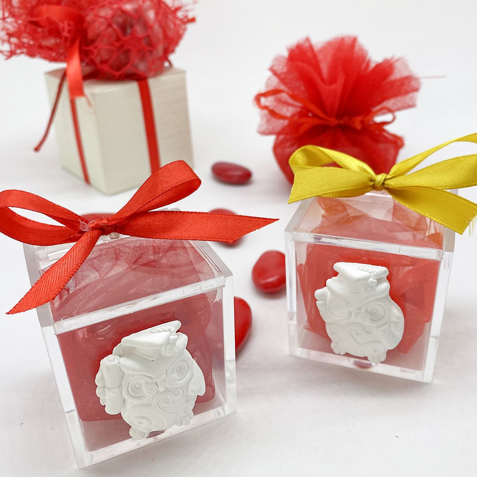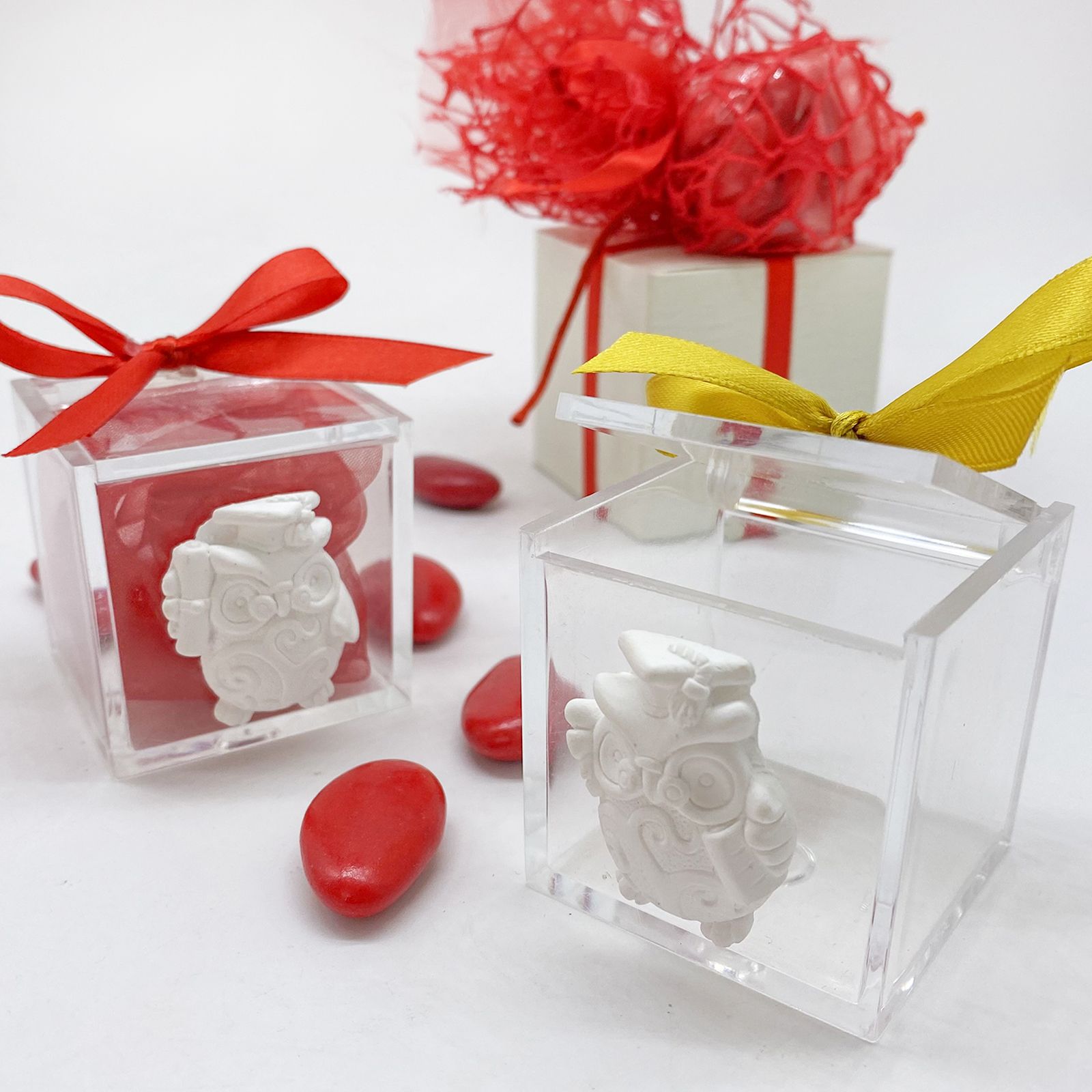 Non perdere l'occasione di regalare una bomboniera economica unica e indimenticabile. Scegli la scatolina plex trasparente portaconfetti segnaposto con gesso bianco gufetto per la tua laurea o altri eventi speciali legati al mondo accademico.