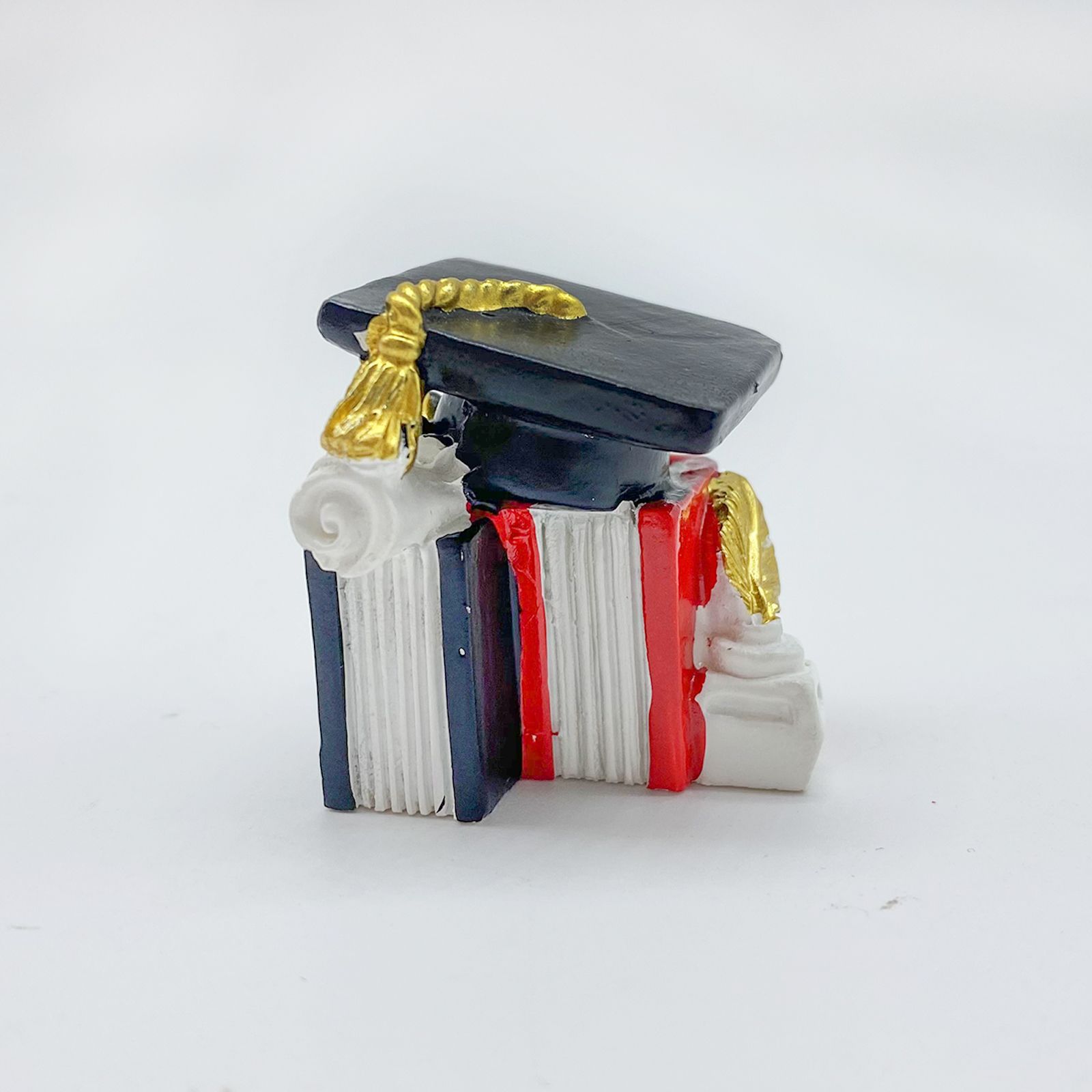 All'interno della scatolina, troverai un ricordino laurea in resina, raffiguranti due libri con copertina rossa e nera, accanto a una penna e un calamaio. I libri sono sormontati da una pergamena bianca e da un grande tocco nero con nappa dorata, simboleggianti la sapienza e il compimento degli studi.