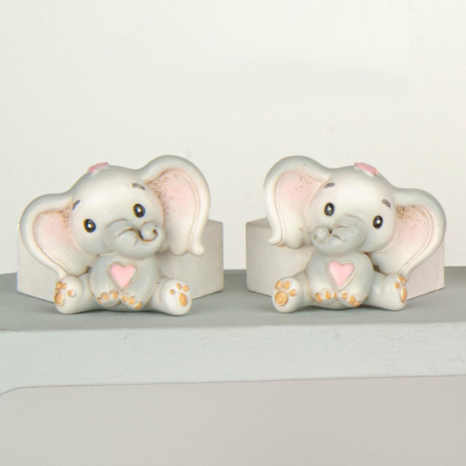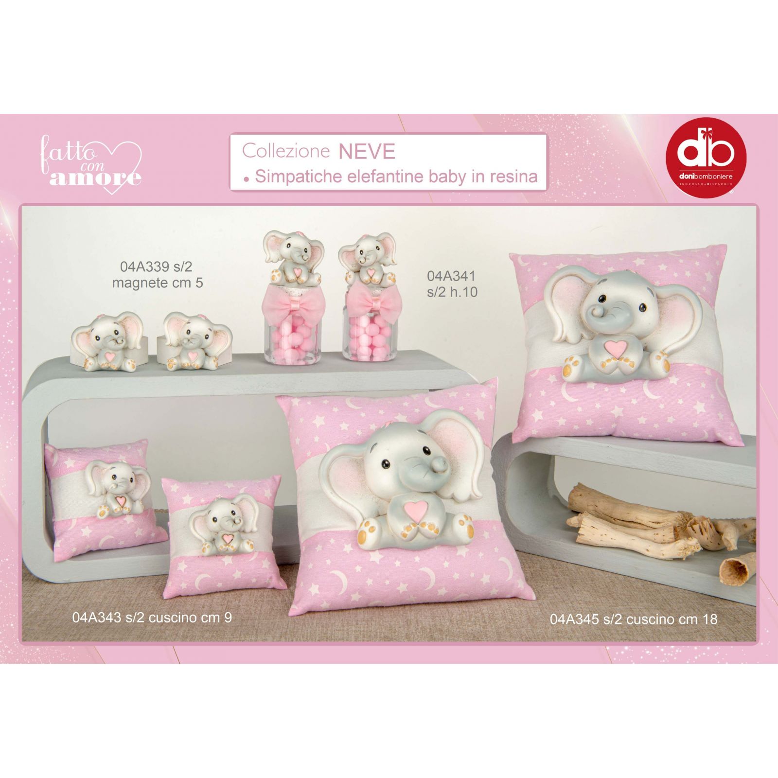 Magnete linea Neve con elefantino seduto che abbraccia un cuoricino, gadget ideale per feste di bambina. Un originale regalo per le occasioni più speciali come una nascita, un battesimo o un primo compleanno, ma anche una decorazione divertente per sacchetti porta confetti da dare come dono agli invitati. Realizzato in resina di colore grigio e rosa, questo magnete misura circa 5 cm.