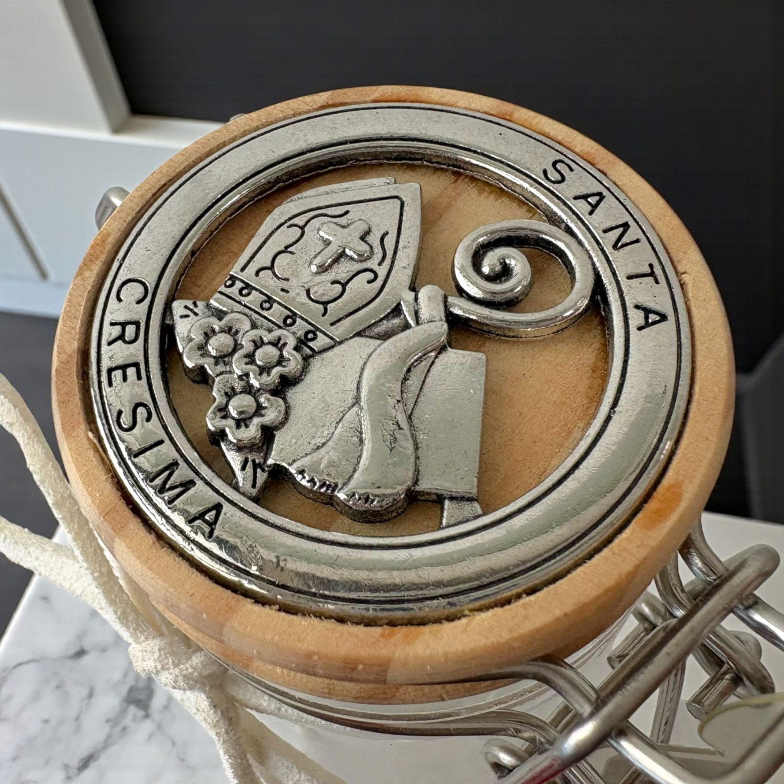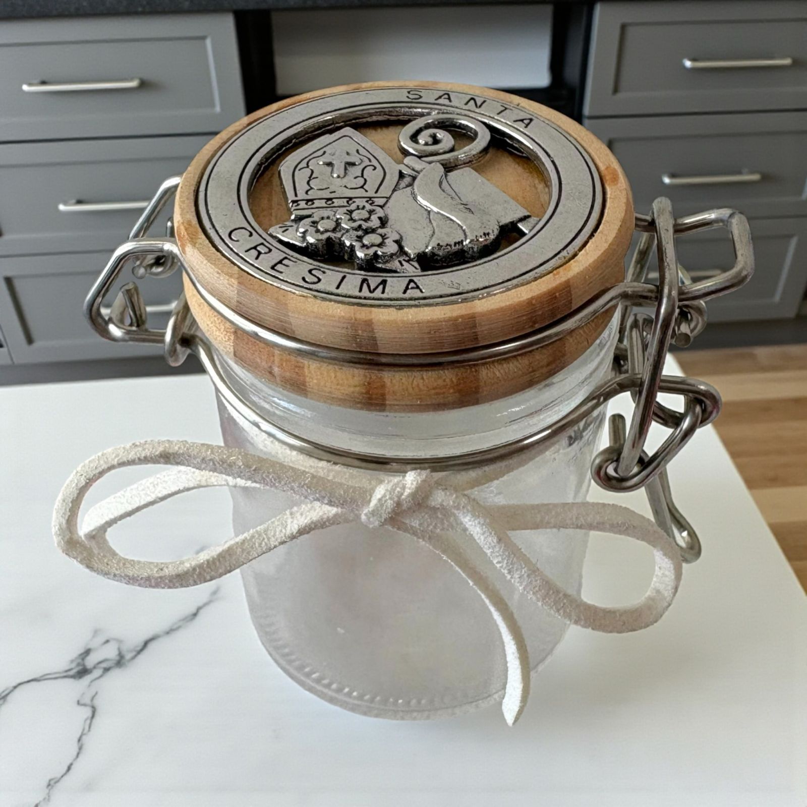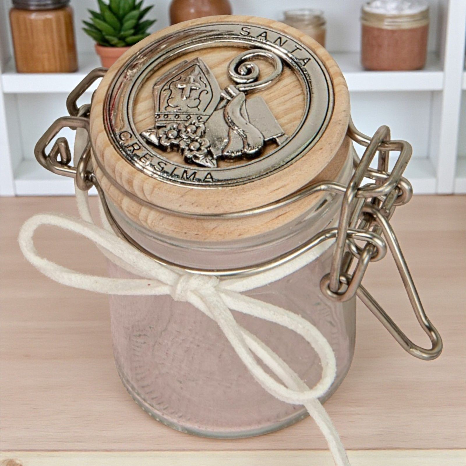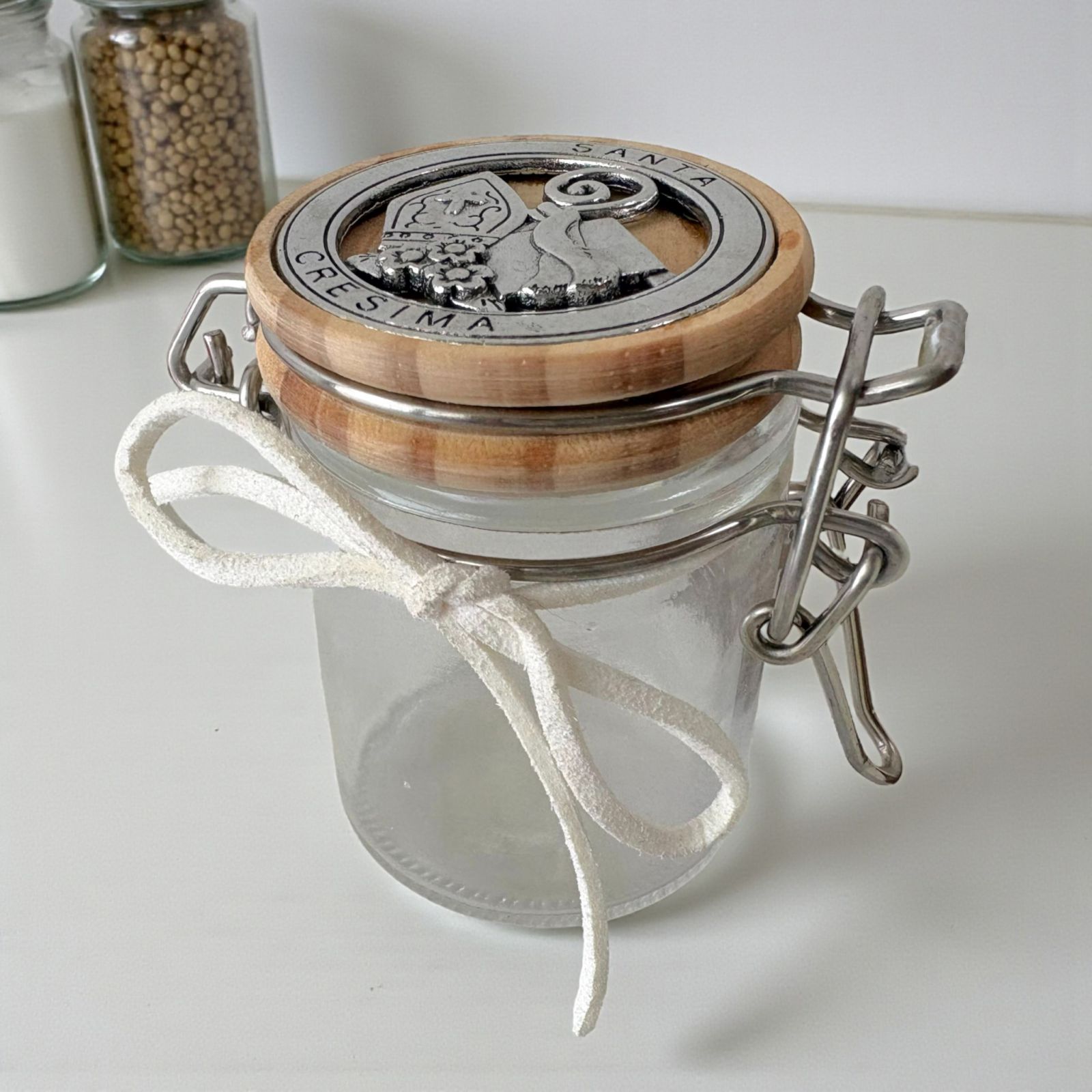 Rendi unica la tua confettata originale con questo delizioso vasetto con chiusura ermetica. Realizzato in vetro e dotato di un tappo in legno con applicazione in metallo con scritta santa cresima e simboli sacri, questo regalo di santa cresima è un segnaposto speciale ed unico. Le sue dimensioni, altezza 7 cm circa, lo rendono funzionale, pratico e versatile. Puoi usarlo come un barattolo per spezie, come un contenitore per confetti o caramelle, o per trasformarlo in un segnaposto da tenere come ricordo oppure donarlo come idea regalo. La sua tonalità color legno naturale lo rende un oggetto d'arredo perfetto anche come decorazione nella tua casa. Regalare un vasetto con chiusura ermetica con il simbolo di santa cresima è un modo per far sentire il destinatario speciale e partecipe di un momento di gioia, come la conferma della fede. Un simbolo di fede come la mitra, la pastorale e la bibbia, lo rende un oggetto davvero unico ed indimenticabile.