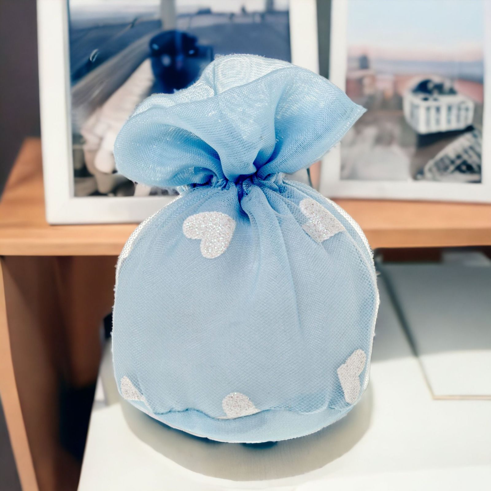 Che dire allora del sacchettino portaconfetti celeste con cuoricini bianchi glitterati? Una bellissima confettata di amore e tenerezza, perfetta per un battesimo, la nascita di un bimbo, un gender reveal o un baby shower.