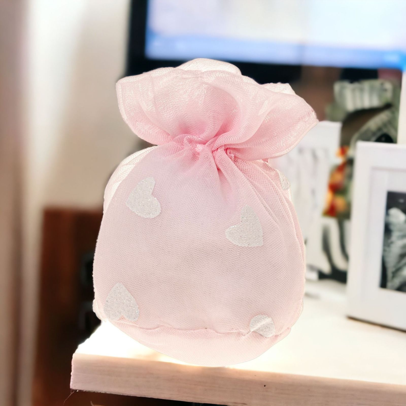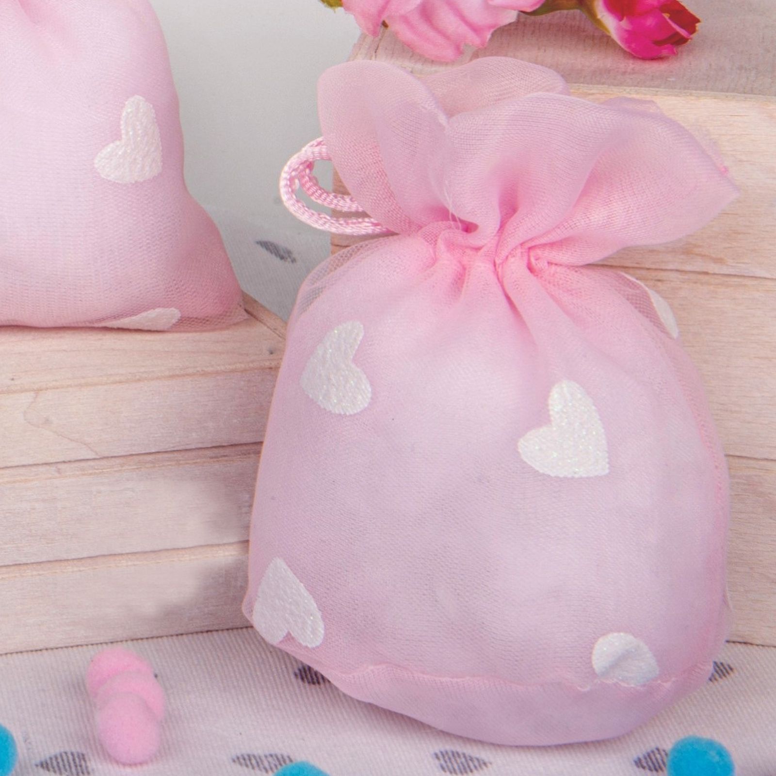 Rendi la tua confettata ancora più dolce con questo sacchettino portaconfetti rosa con cuoricini bianchi glitterati!