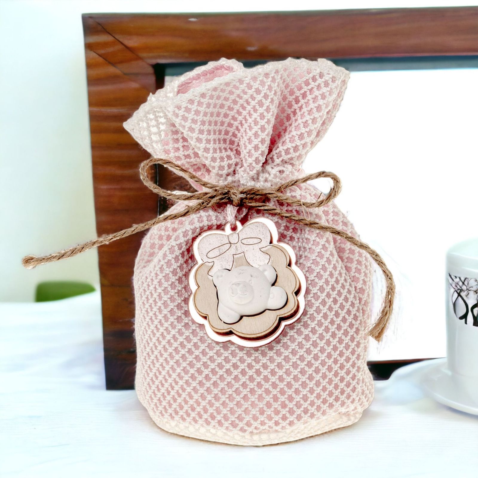 Realizzata in tessuto con trama a rete bianca e rosa con applicazione in legno e gesso di un simpatico orsetto e fiocco rosa sono l'ideale per una confettata unica, che resterà per sempre nei ricordi.