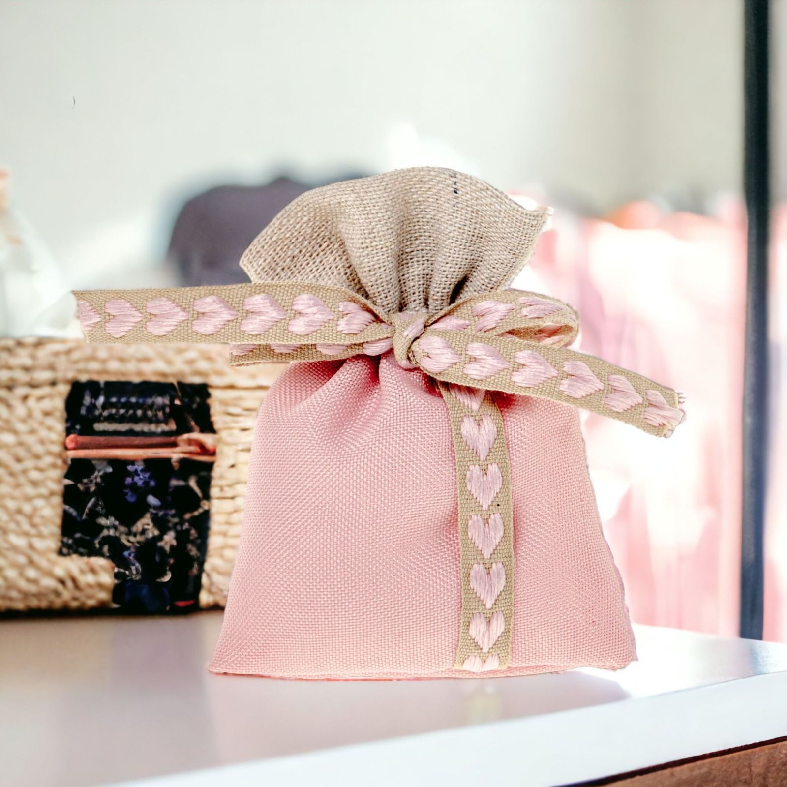 Regala tenerezza e dolcezza anche nel momento della confettata con i nostri sacchetti per confetti rosa e beige con nastrino e fiocchettino beige con cuoricini rosa. I nostri sacchetti si adattano a ogni evento come nascita, battesimo, primo compleanno, geneder reveal e baby shower.