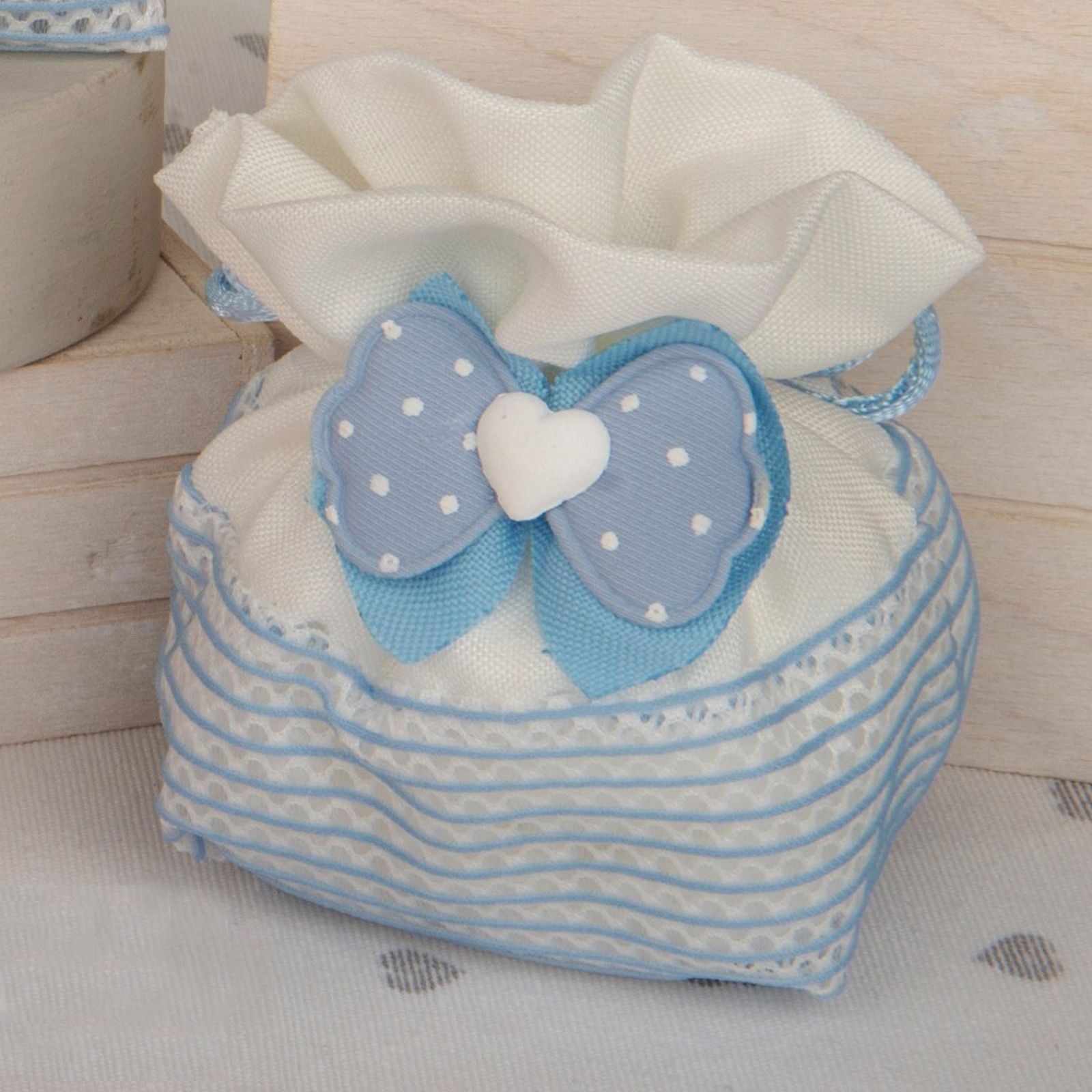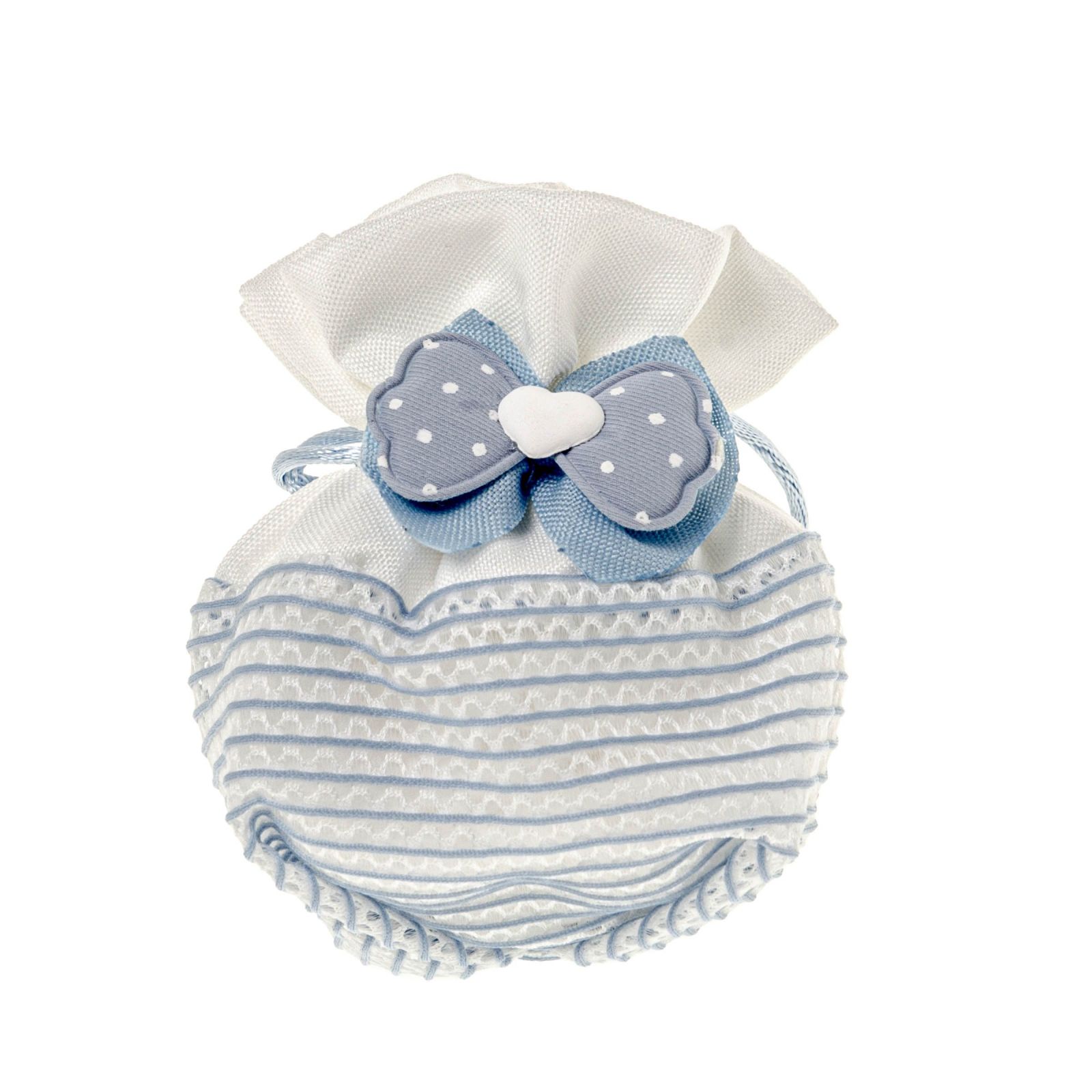Una bomboniera così preziosa sarà un ricordo indelebile per i tuoi ospiti. Riempila di dolcezza con le tue confettate e rendi la tua festa ancora più colorata ed allegra. La misura di 10 cm circa e le sue stupende decorazioni nella parte inferiore con il doppio fiocco celeste e a pois con al centro il cuoricino bianco renderanno ancora più speciale la tua confettata.