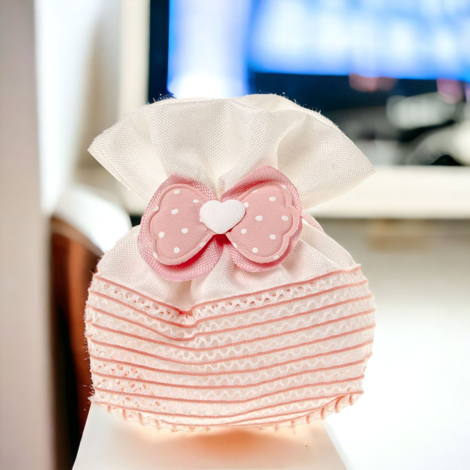 Elegante sacchetto tondo per confetti con decorazioni nella parte inferiore e doppio fiocco rosa e a pois con raffinato cuoricino bianco