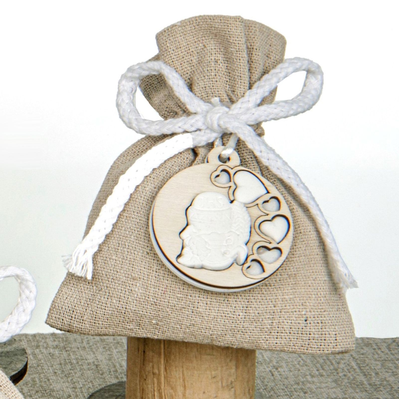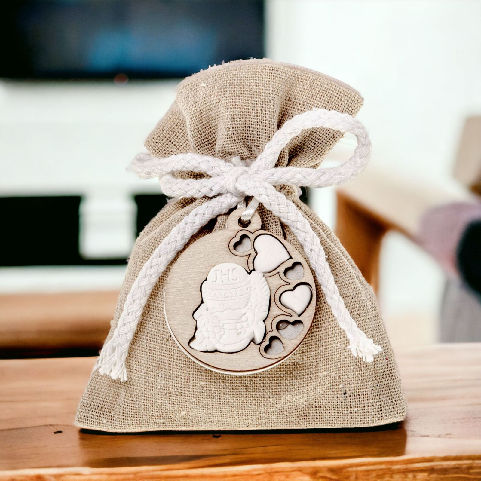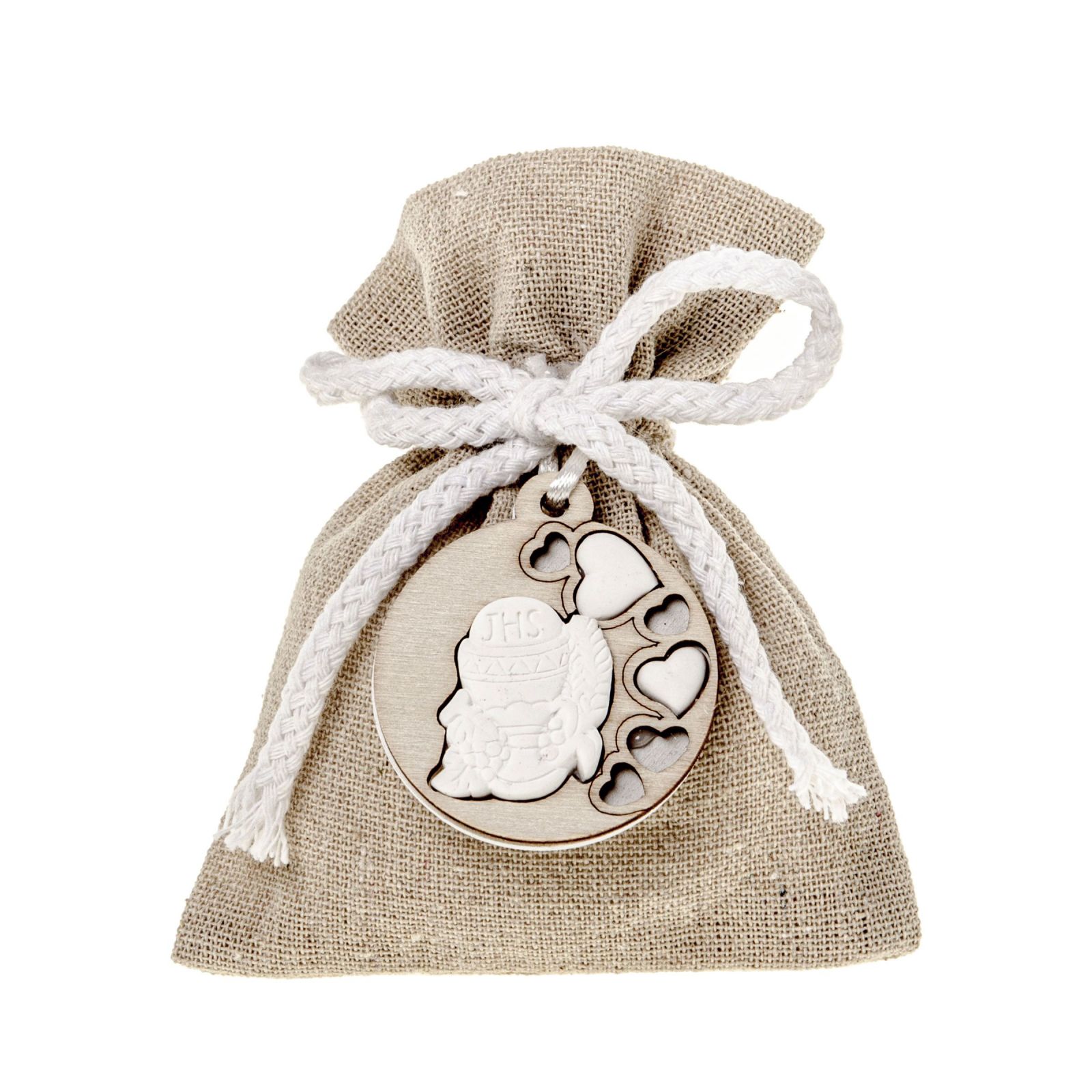 Il sacchettino in juta con cordoncino e applicazioni in legno simboli Sacri è il regalo perfetto per gli invitati di una Prima Comunione. Una scelta che sia per un maschietto o per una femminuccia, questi ricordini saranno una bella sorpresa per tutti.