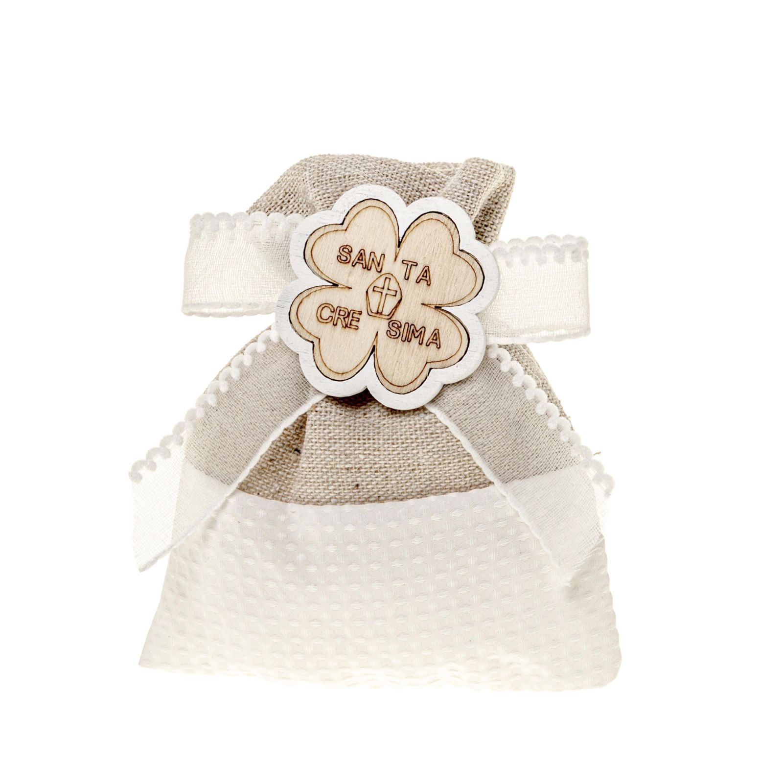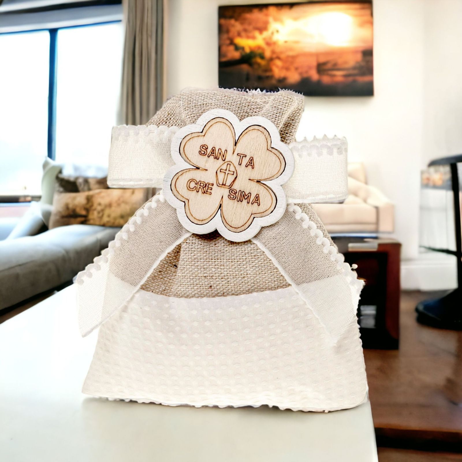 Regala un dono speciale per la Cresima di una persona cara con questo bellissimo sacchettino in cotone juta bianco e beige con un fiocco in organza bianco ed un quadrifoglio in legno con la scritta "La mia Cresima". Uno splendido portafortuna per una confettata in stile originale. Un'idea regalo esclusiva per una giornata importante, il sacchetto è un pensierino originale che sarà ricordato a lungo.