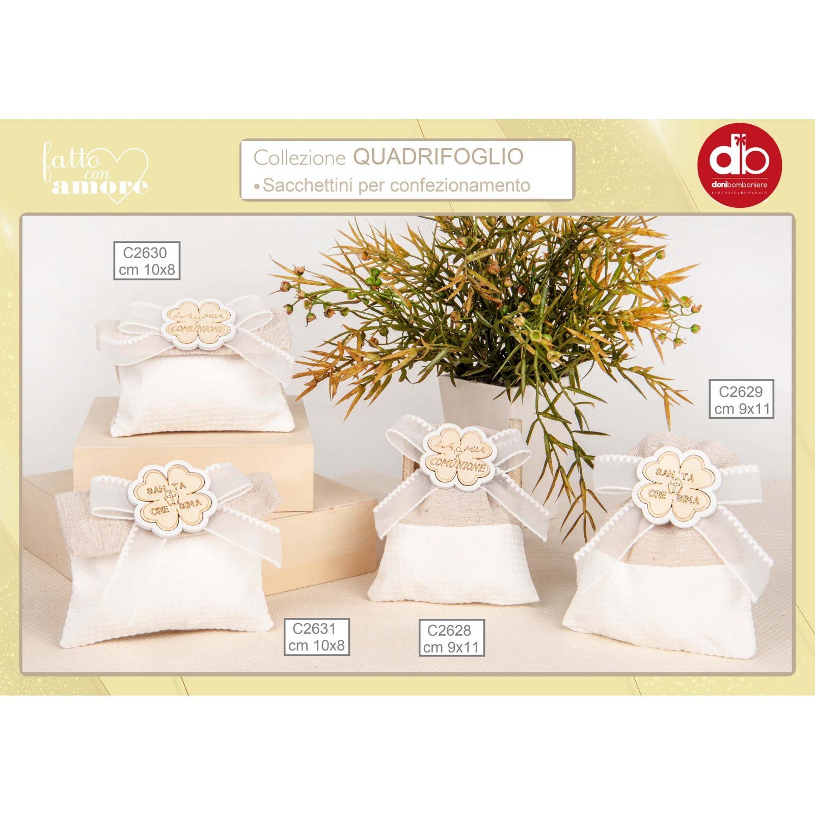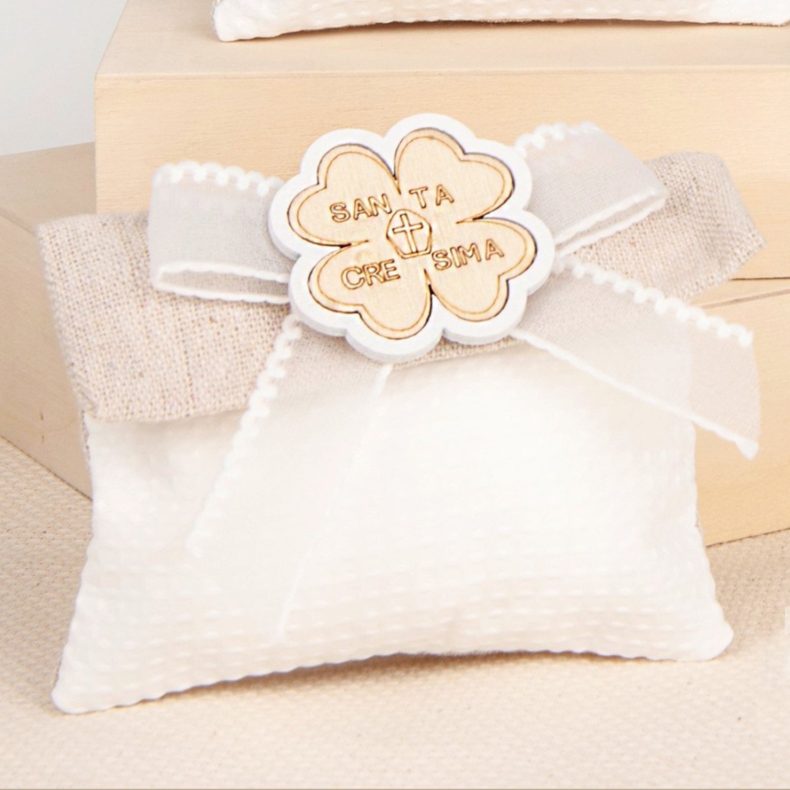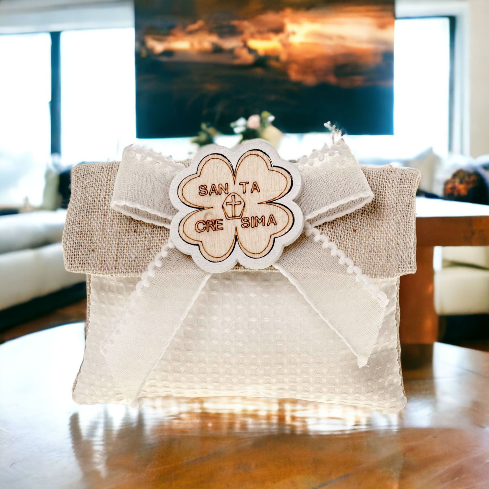 Crea un momento magico e unico con il nostro sacchettino a bustina color juta e bianco con fiocco in organza bianco e quadrifoglio in legno con scitta "la mia Cresima". Realizzato in morbido cotone, ha una dimensione di 10 CM circa. Adatto per ogni occasione, è la scelta ideale per la cresima di tuo figlio. Perfettamente scenografico, il sacchettino si adatta a ogni tipo di confettata, portaconfetti, pensierini o portafortuna. Un regalo speciale e ricordo unico per i tuoi invitati.
