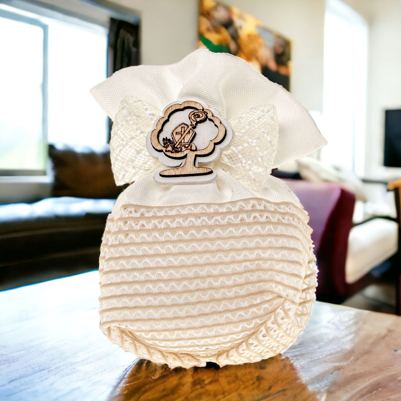 Regala una bomboniera unica per la Santa Cresima dei tuoi cari. Questo sacchettino tondo in cotone bianco e beige è decorato con un fiocco di organza e un'applicazione in legno a forma di Albero della Vita con simboli sacri, cappello e bastone del vescovo. Offri un pensierino di pregio come un regalo indimenticabile per i tuoi ospiti.