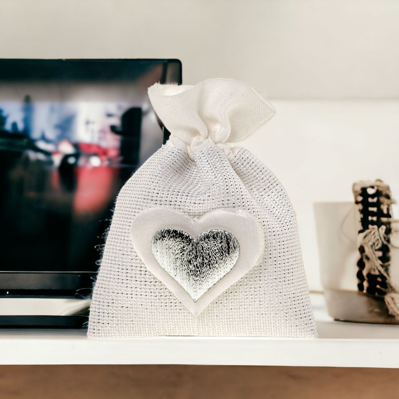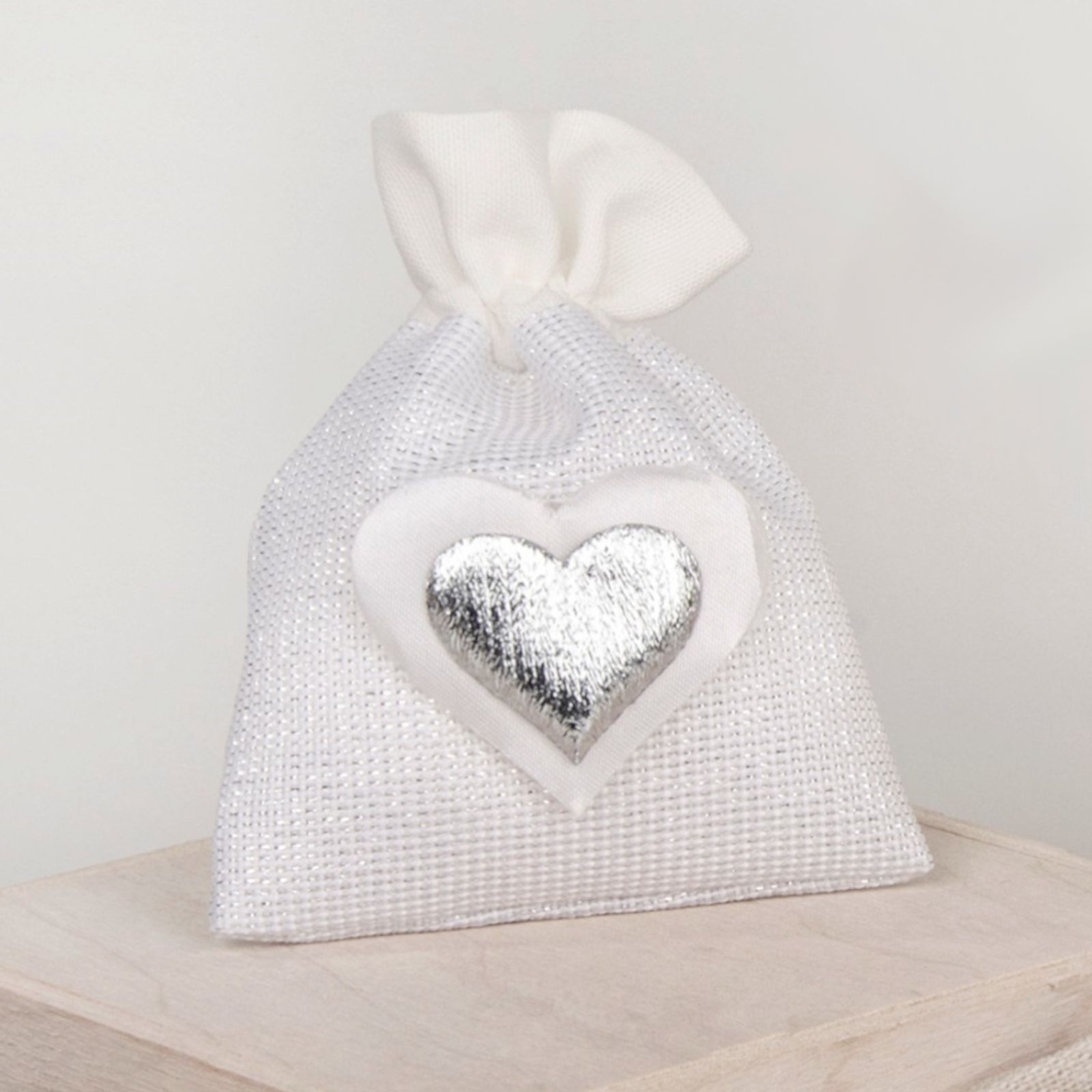 Concediti un regalo di nozze d'argento di tendenza con questo sacchetto porta confetti della linea Heart Silver Bag. Questo oggetto pregiato è realizzato in tessuto laminato di colore argento e bianco, presenta un doppio cuore sovrapposto sulla parte frontale, bianco e argentato, che renderà il tuo tavolo di nozze unico ed elegante. La dimensione della bomboniera è di 8x10 cm circa.
