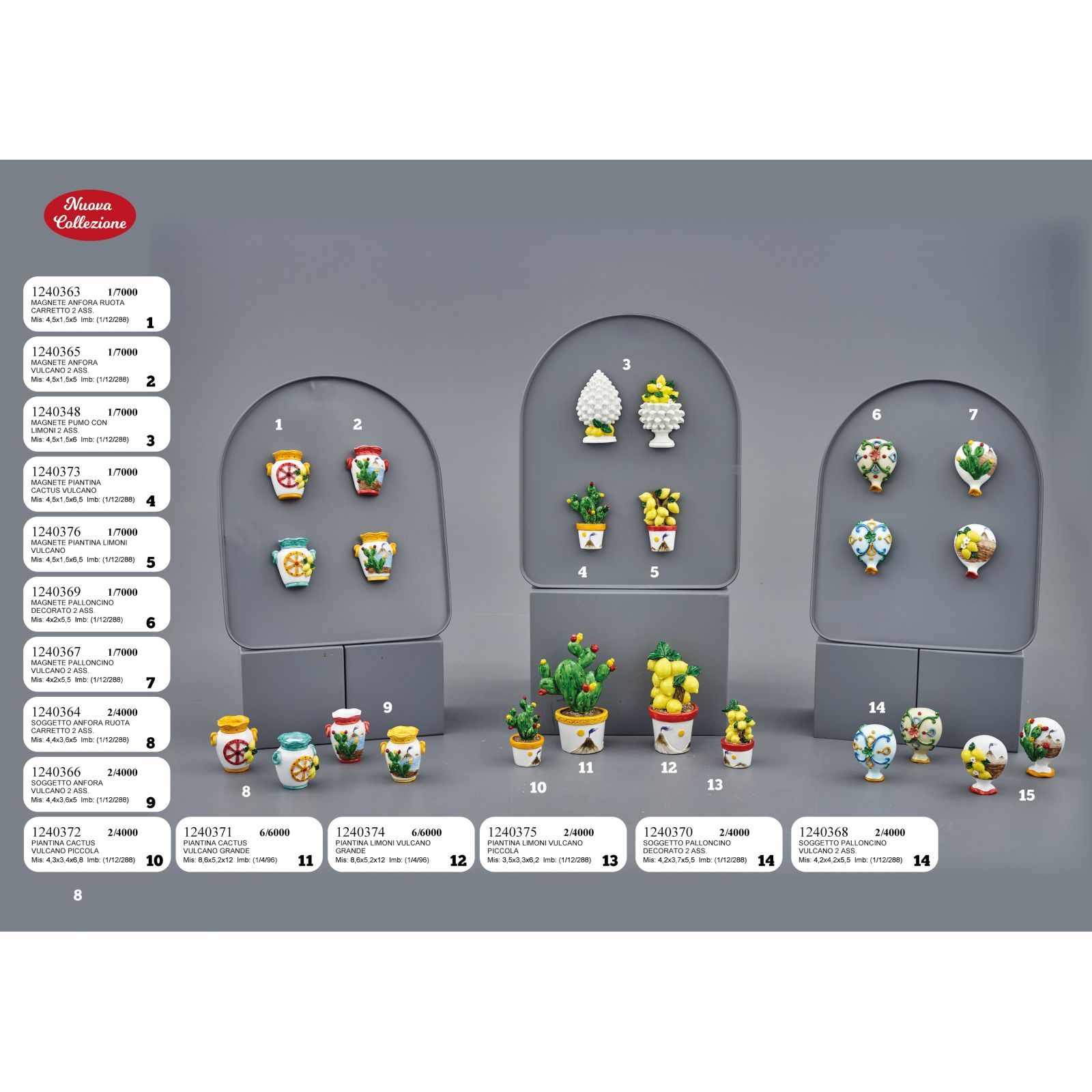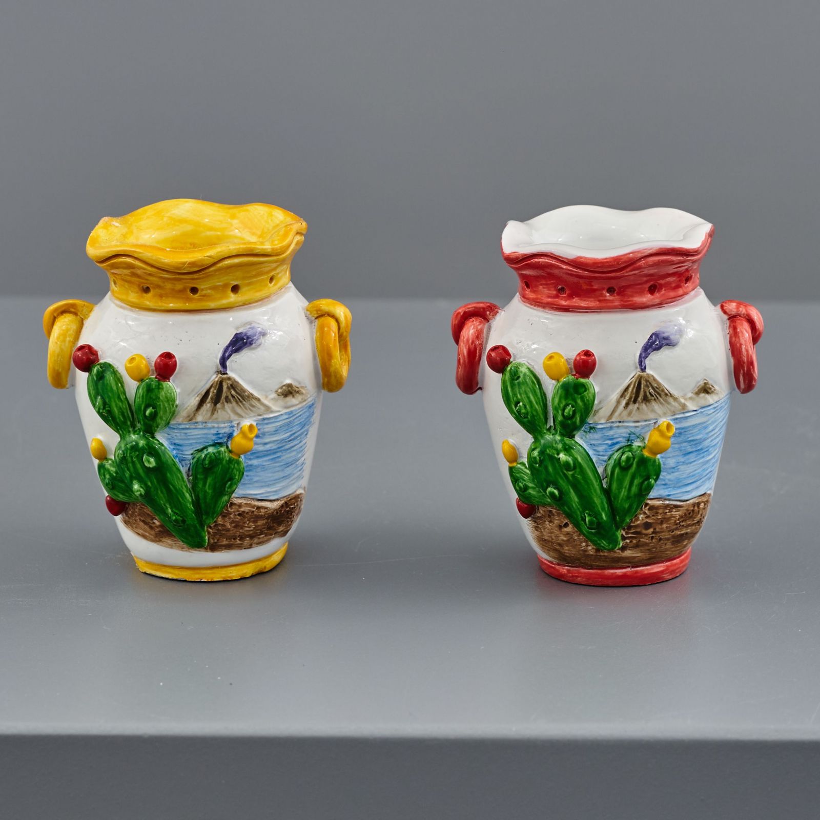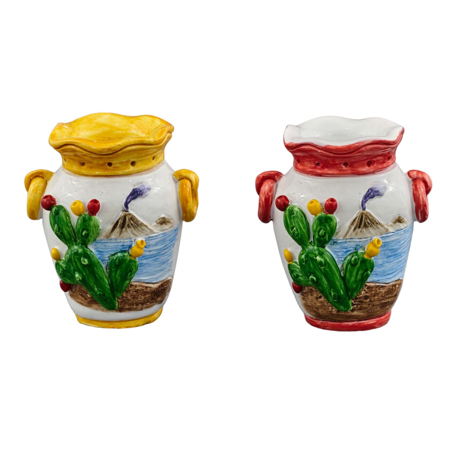 Scopri questa anfora assortita dalla forma particolare caratterizzata da un bordo e dei manici che sono assortiti tra gialli o rossi, con raffigurazione di un cactus con sfondo marino e vulcano. Realizzata con materiale di ceramica, questo oggetto presenta dimensioni pari a 4,3x3,4x6,8, adatta per l'occasione di un matrimonio, nozze o feste a tema sicilia. Ideale come segnaposto, simbolo della Sicilia, per rendere unico il tuo evento. Regalare una bomboniera è un gesto che esprime attenzione e apprezzamento.