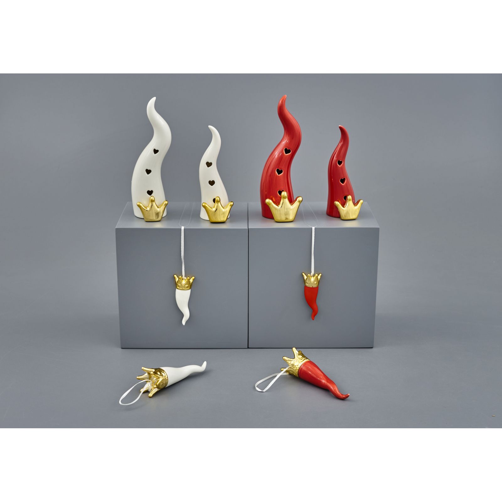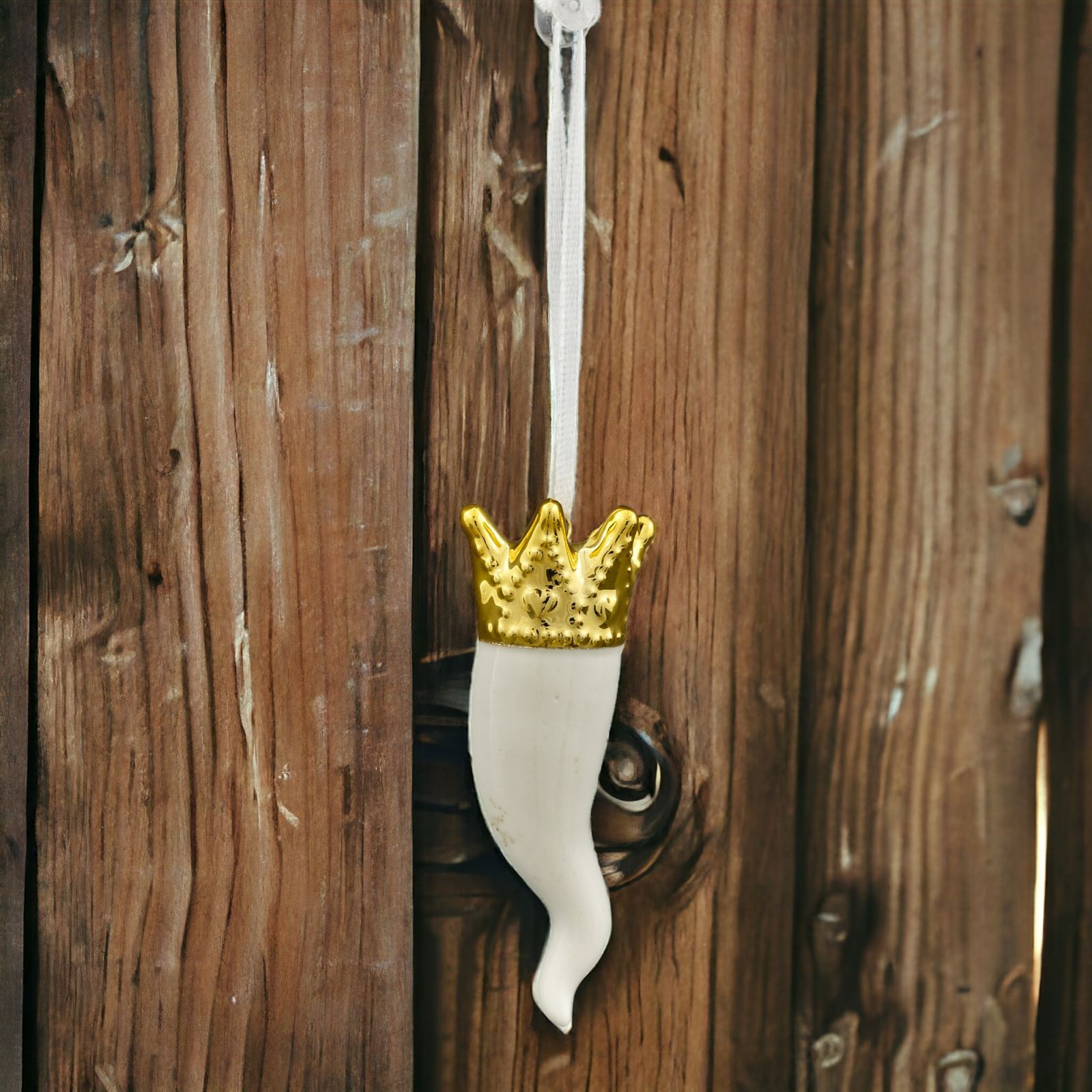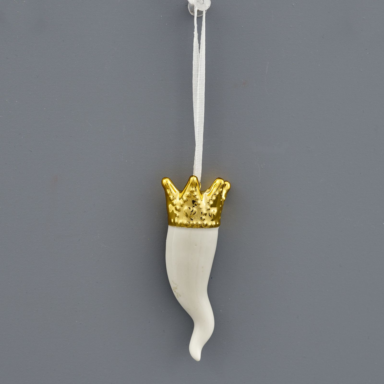 Regala un appendino a forma di cornetto con una preziosa corona d'oro per celebrare in modo speciale una Prima Comunione, una Santa Cresima, un 18esimo compleanno, un matrimonio o un anniversario. Realizzato in ceramica di colore bianco con una corona dorata, questo originale gadget è un'aggiunta perfetta per i regali più originali. Disponibile in due misure standard e grande (3x1,8x8,7cm circa e 4,5x4x12cm circa ).