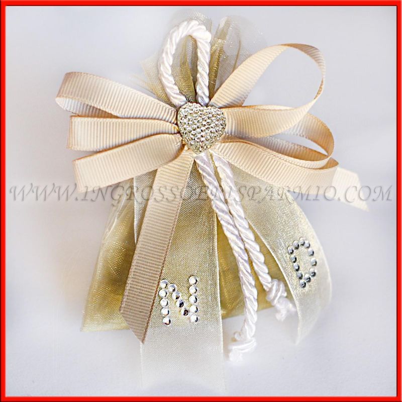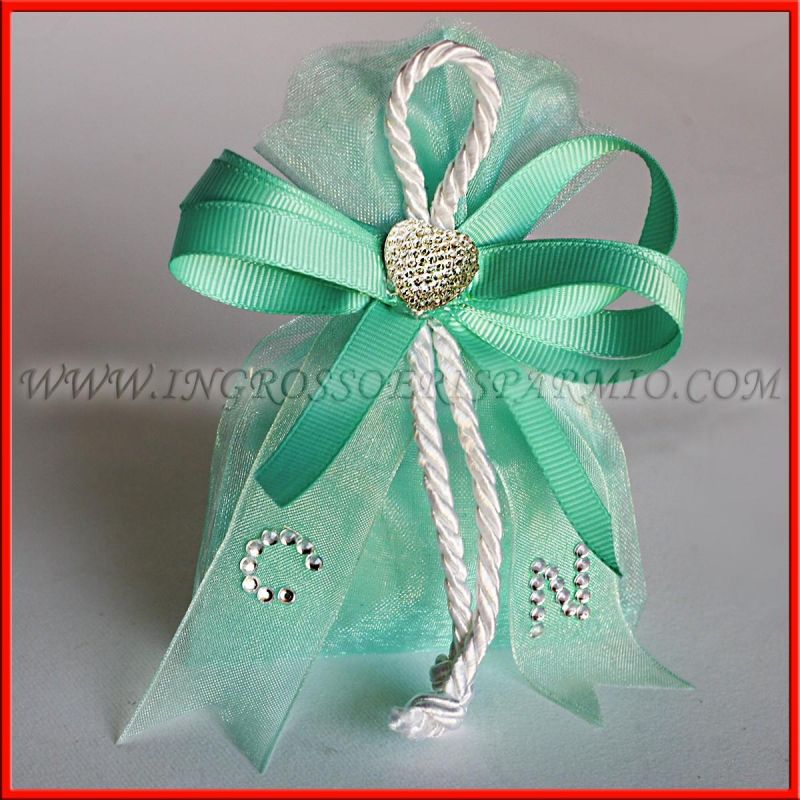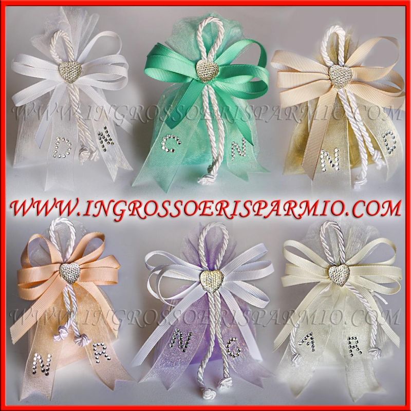 Sacchetti per confetti in tulle, realizzati a mano da esperti nel confezionamento, ed arricchiti da numerosi dettagli: una comosizione a triplice fiocco con nastro bianco, con al centro un cordoncino in tessuto ed un'applicazione a forma di cuoricino. Sul nastro in tulle è possibile inserire le iniziali degli sposi, realizzate con dei piccoli strass argentati.