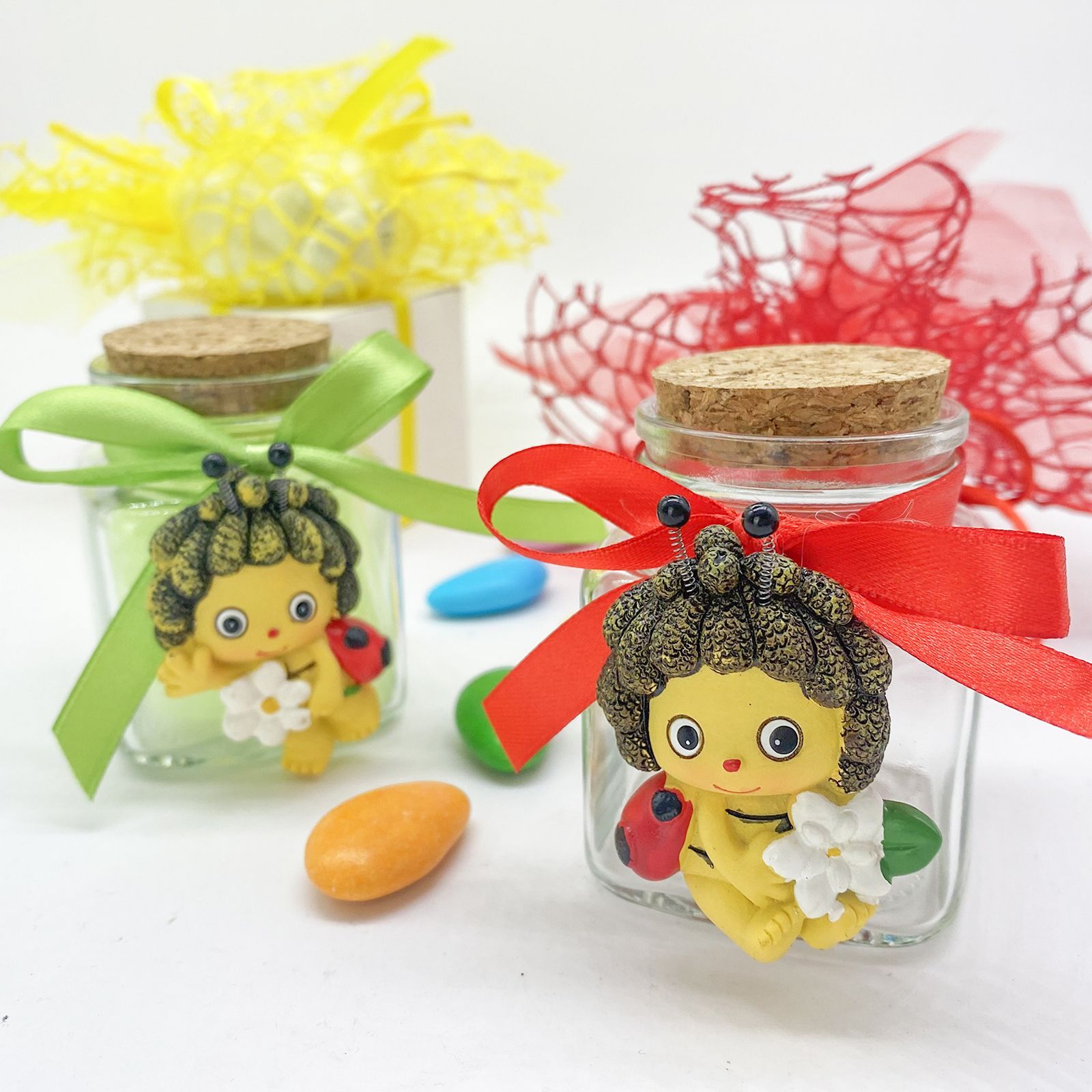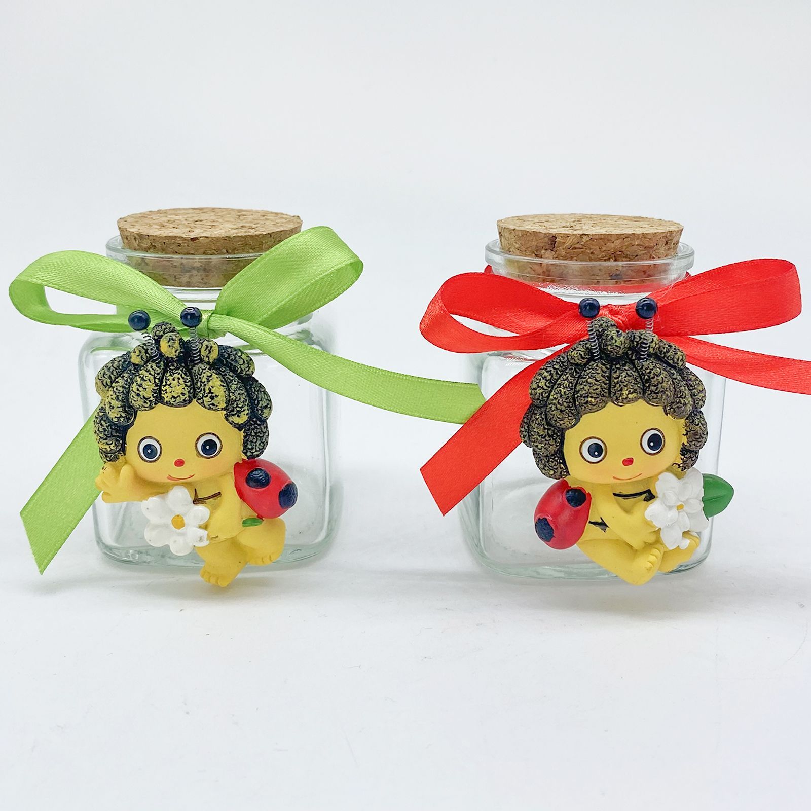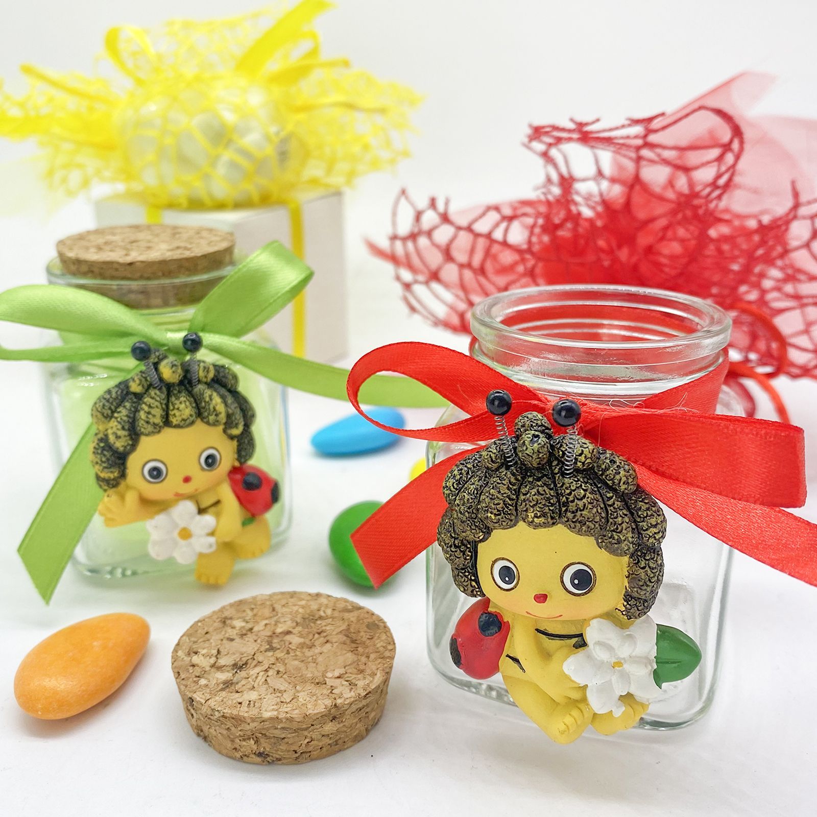 Il nostro barattolino per confetti con tappo in sughero e simpatica coccinella è la bomboniera perfetta per celebrare momenti speciali come nascita, battesimo e comunione. Realizzato in vetro di alta qualità, il barattolino misura 7x5 cm (50 ml) circa, mentre la coccinella in resina è di 6x4,5 cm.