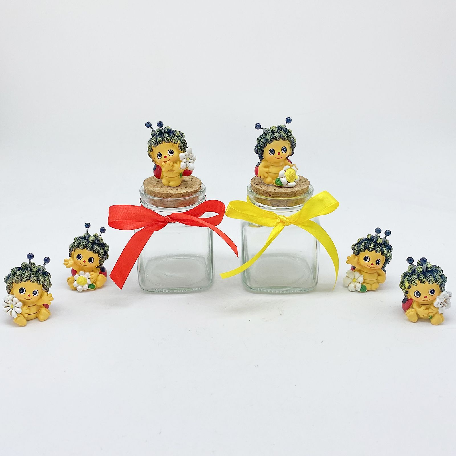 Realizzato con materiali di alta qualità, il barattolo misura 5 cm di diametro e 8 cm di altezza, dimensioni ideali per contenere dolci confetti o spezie aromatiche. La coccinella,misura 2 x 4,5 cm circa (antenne incluse), simbolo di fortuna e prosperità, aggiunge un tocco di tenerezza e originalità a questa bomboniera.
