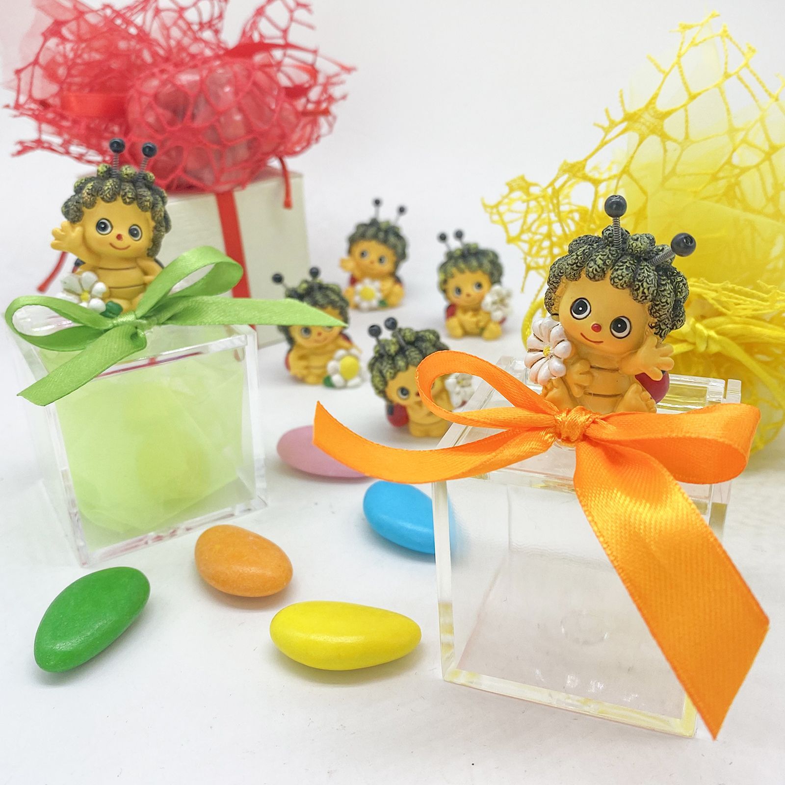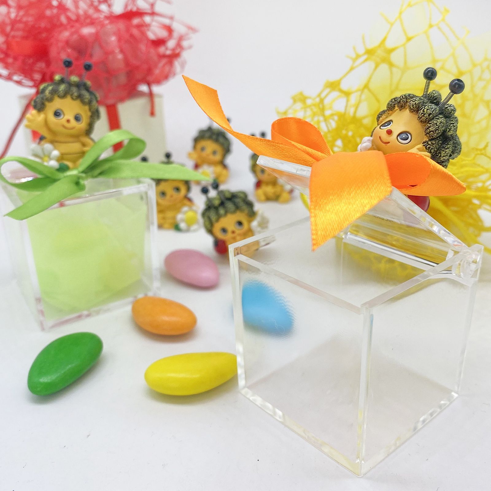 Ogni scatolina misura 5x5x5 cm e presenta una coccinella pastello di dimensioni 2 x 4,5 cm, comprese le antennine che si muovono leggermente grazie alla molla integrata. Realizzate in plexiglass di alta qualità, queste scatoline sono eleganti e durature, perfette per contenere confetti o altri piccoli doni.