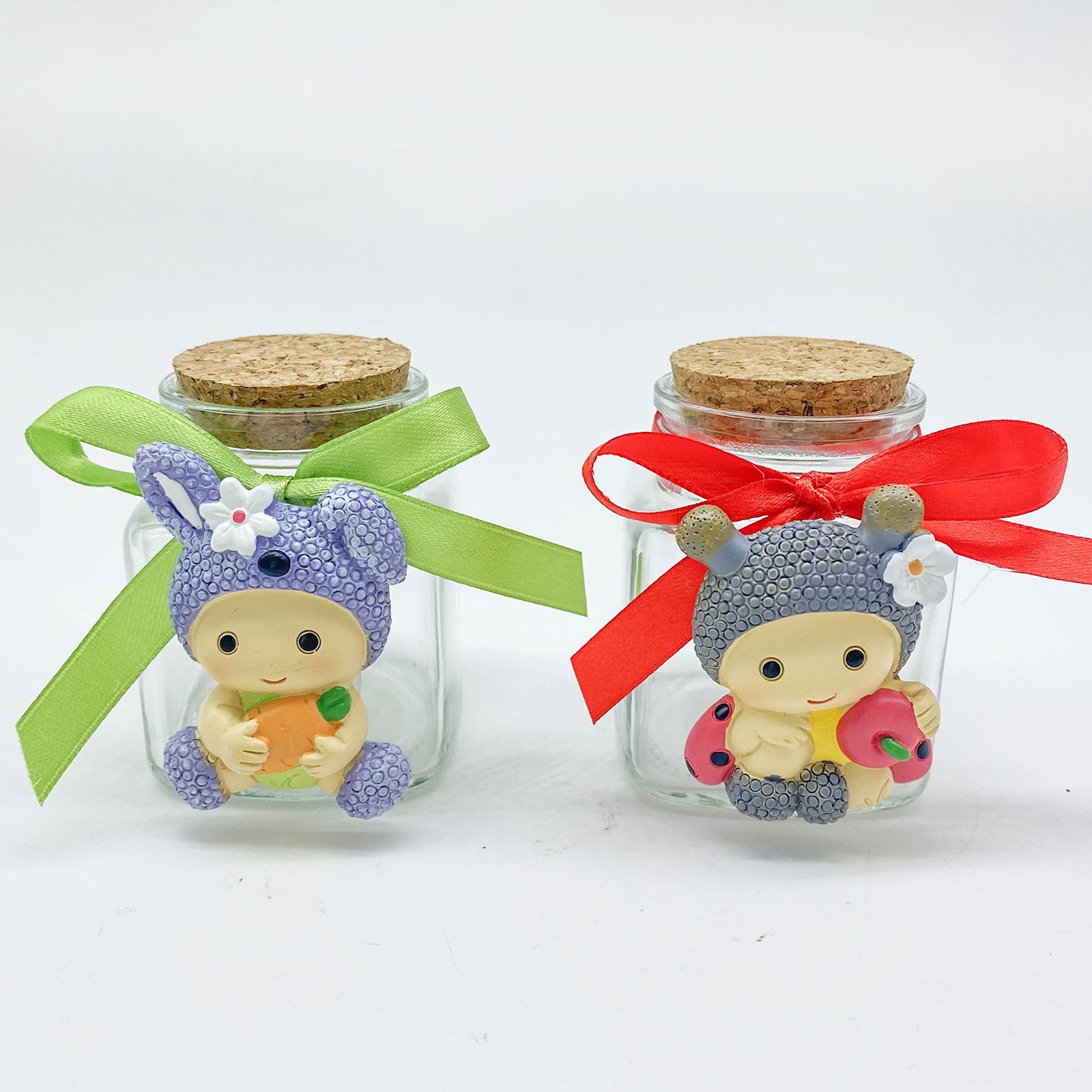 Con dimensioni di 7 cm di altezza e 5 cm di diametro, e una capacità di 50 ml, questo barattolo in vetro di alta qualità è perfetto per contenere confetti o altre piccole delizie. Il bimbo in resina color pastello, che misura 6x4.5 cm, aggiunge un tocco di tenerezza e allegria, rendendo ogni bomboniera un piccolo capolavoro.