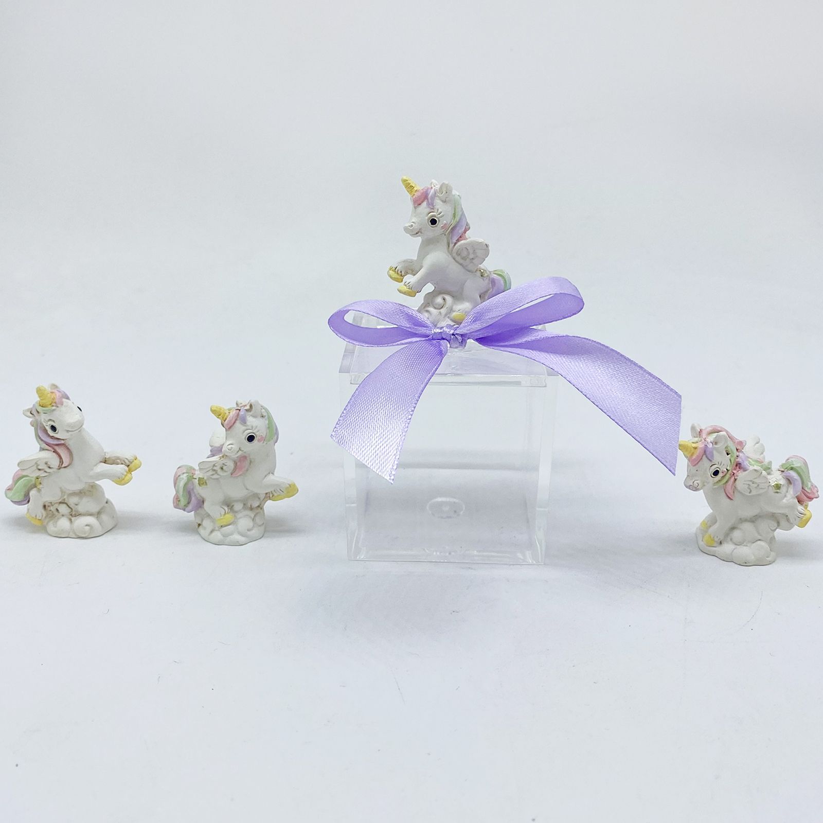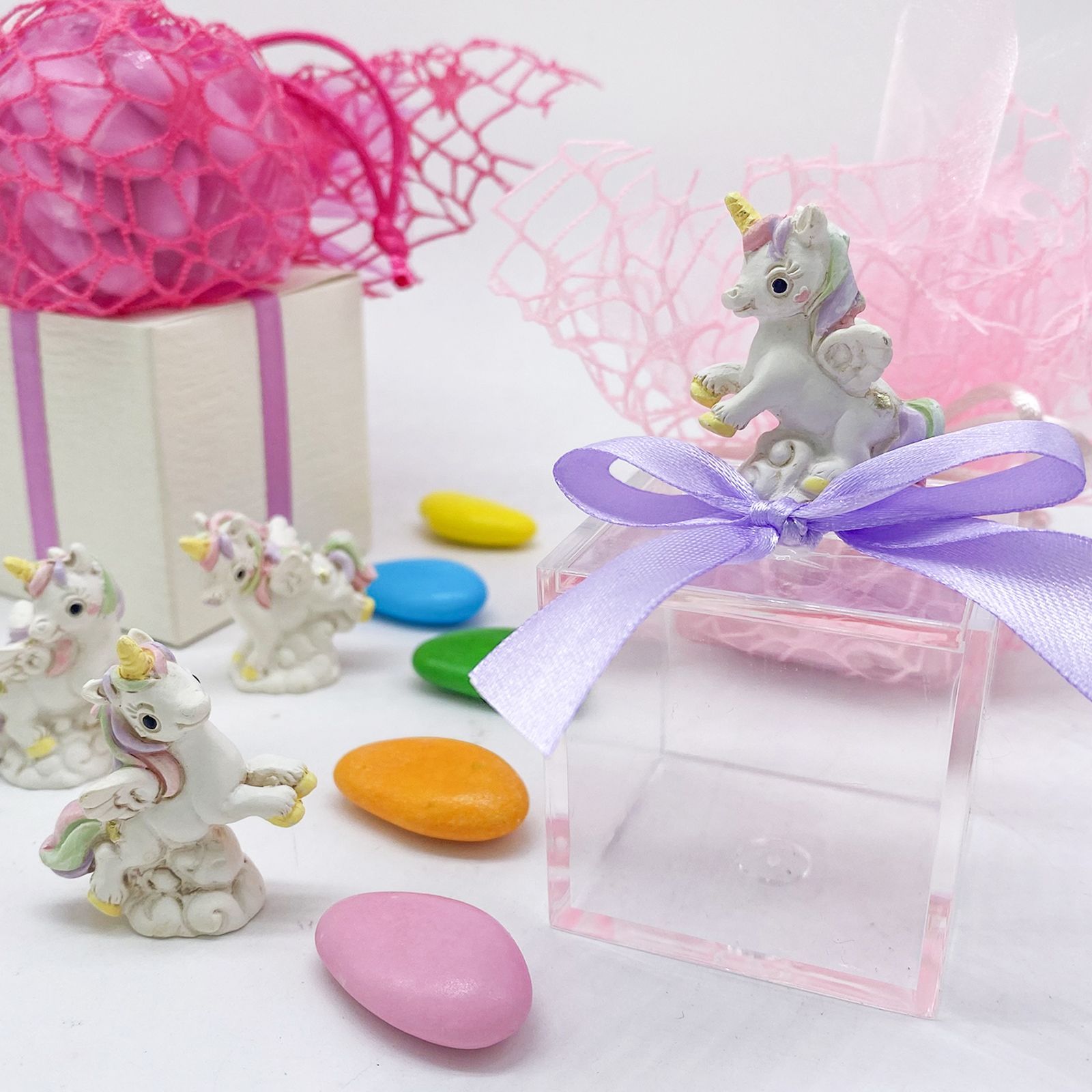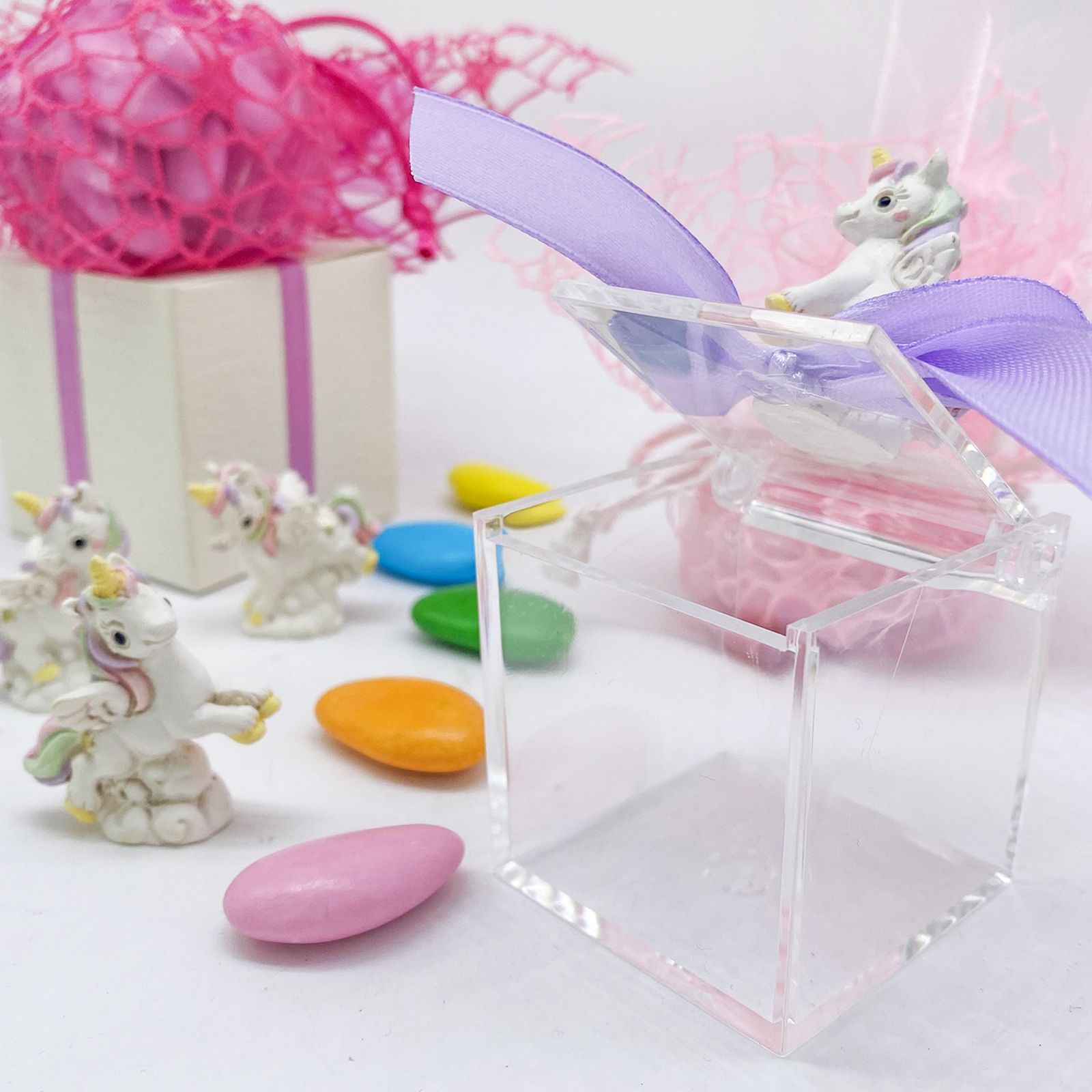 Questa elegante scatolina, realizzata in plexiglass di alta qualità, misura 5x5x5 cm, mentre l'unicorno in resina dalle dimensioni di 4x3 cm, con criniera color arcobaleno e corno giallo, la rende speciale e affascinante. È ideale per contenere piccoli gioielli o confetti, aggiungendo un tocco di eleganza e colore a ogni evento.