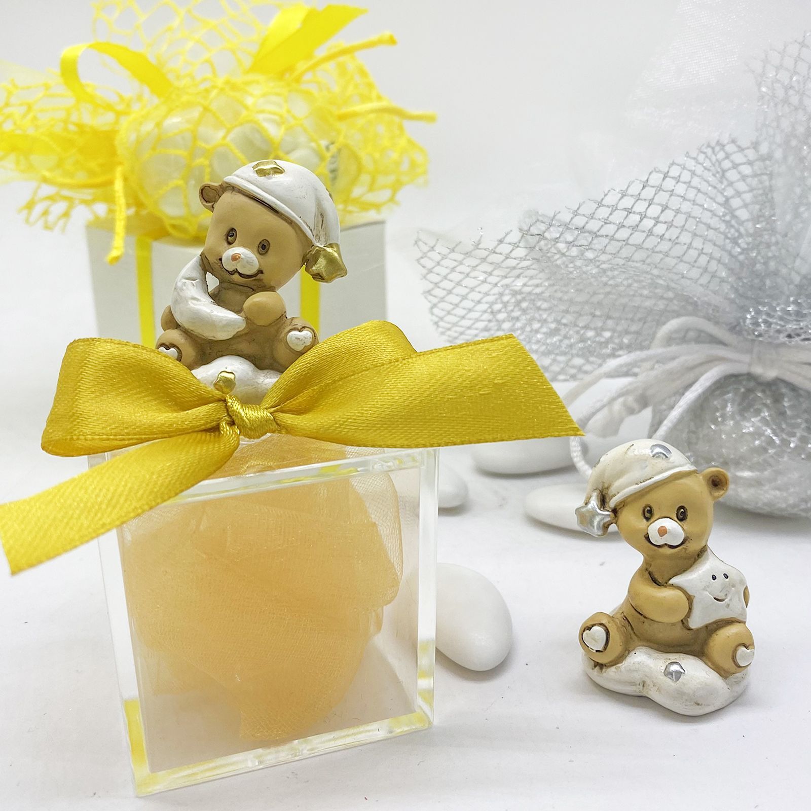 Ogni dettaglio è curato con attenzione per trasmettere un messaggio di affetto e gratitudine. Scegliendo di condividere questa bomboniera con i tuoi invitati, simbolicamente offri loro un ricordo tangibile di un momento gioioso condiviso, incorniciato dalla dolcezza e dall'unicità dell'orsetto su nuvola.