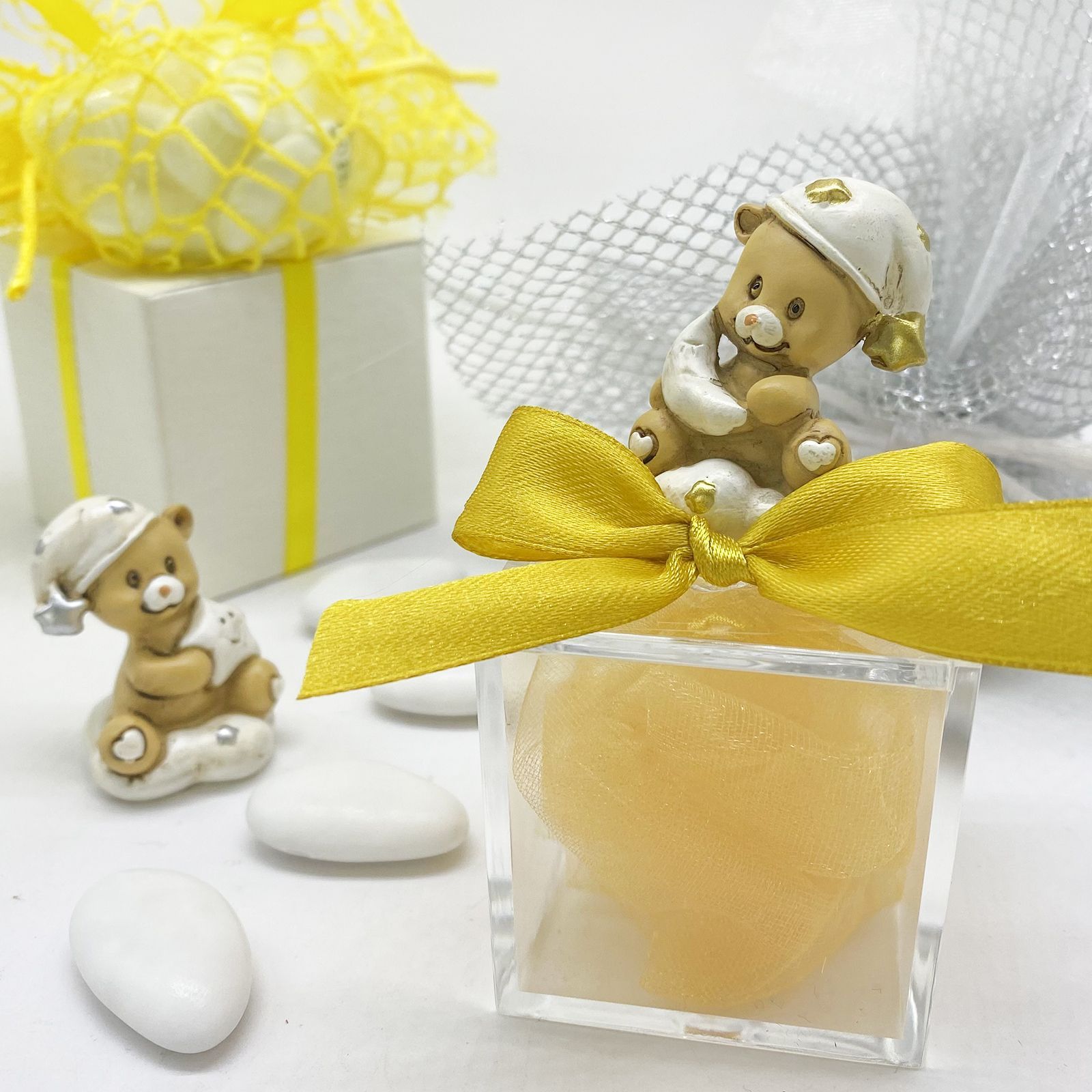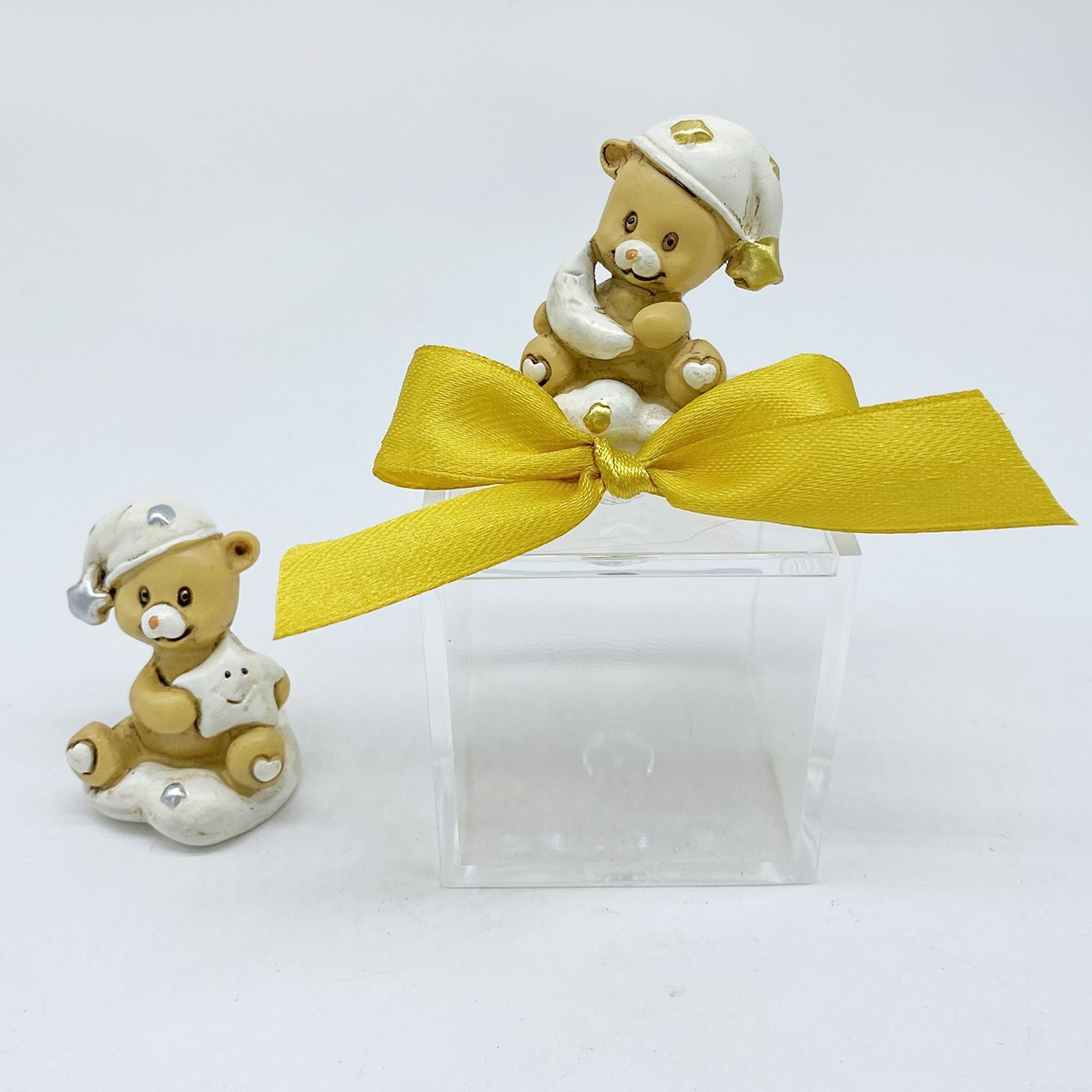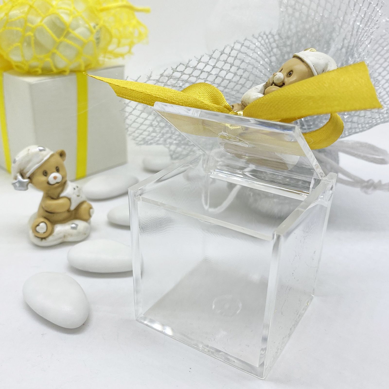 Esplora la dolcezza e l'eleganza della nostra scatolina portaconfetti, pensata per rendere indimenticabili i momenti speciali come nascite, battesimi e compleanni. La scatolina, con dimensioni di 5x5x5 cm, è realizzata in plexiglass, mentre l'orsetto in resina, garantendo durabilità e uno stile raffinato in delicati colori pastello.