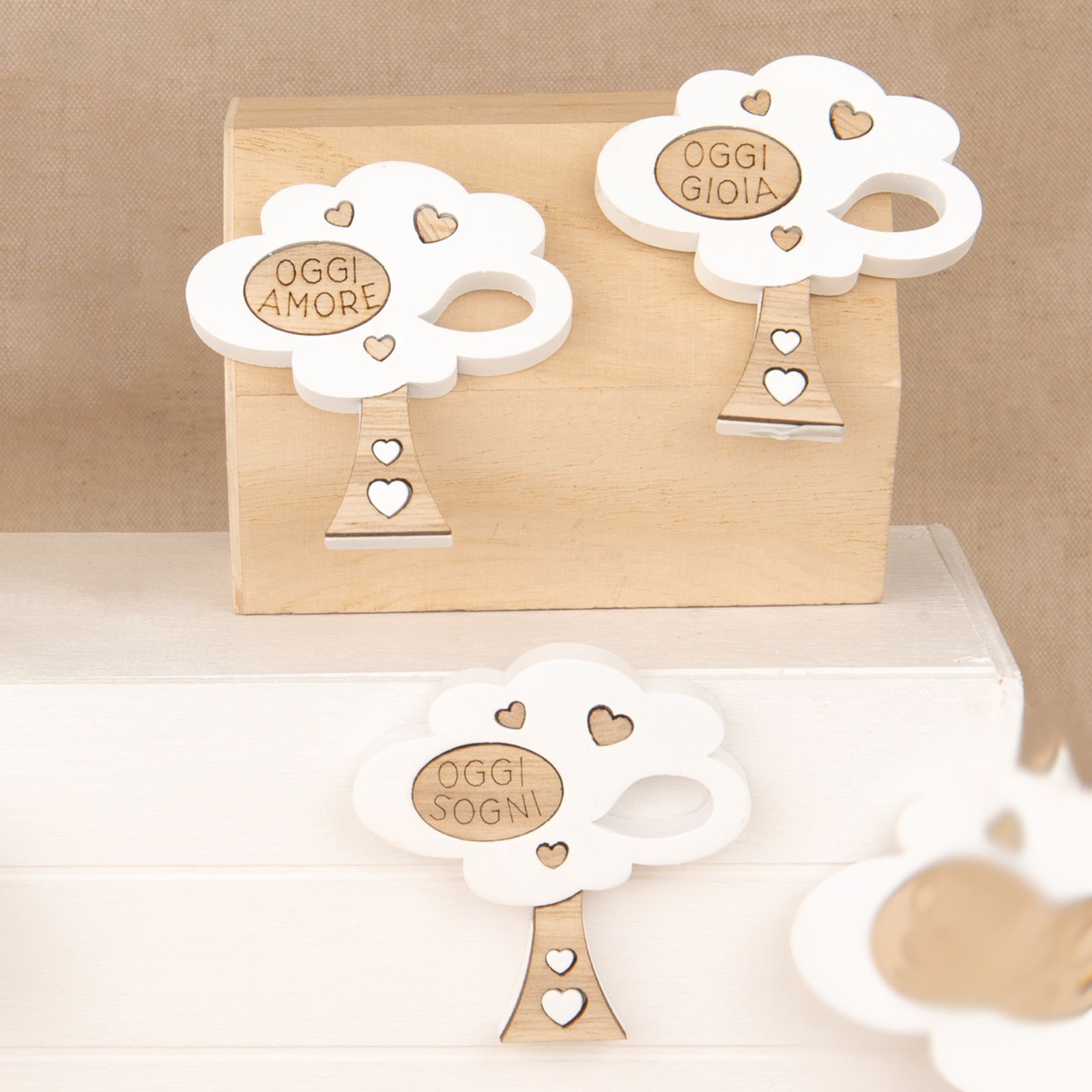 Con dimensioni di circa 6 cm e colori delicati come il legno e il bianco, questa calamita è il regalo perfetto per aggiungere un tocco di eleganza e dolcezza alla tua festa.
