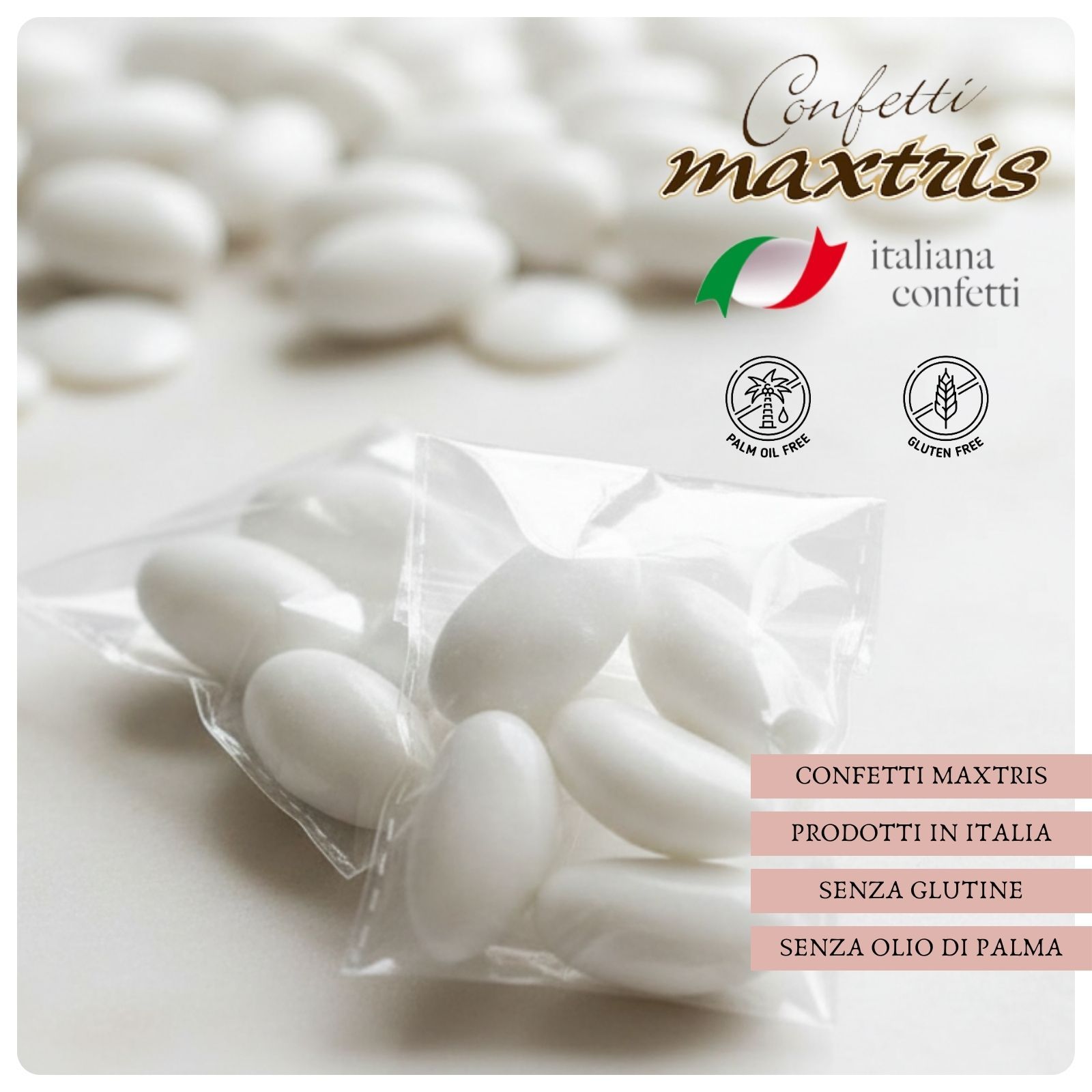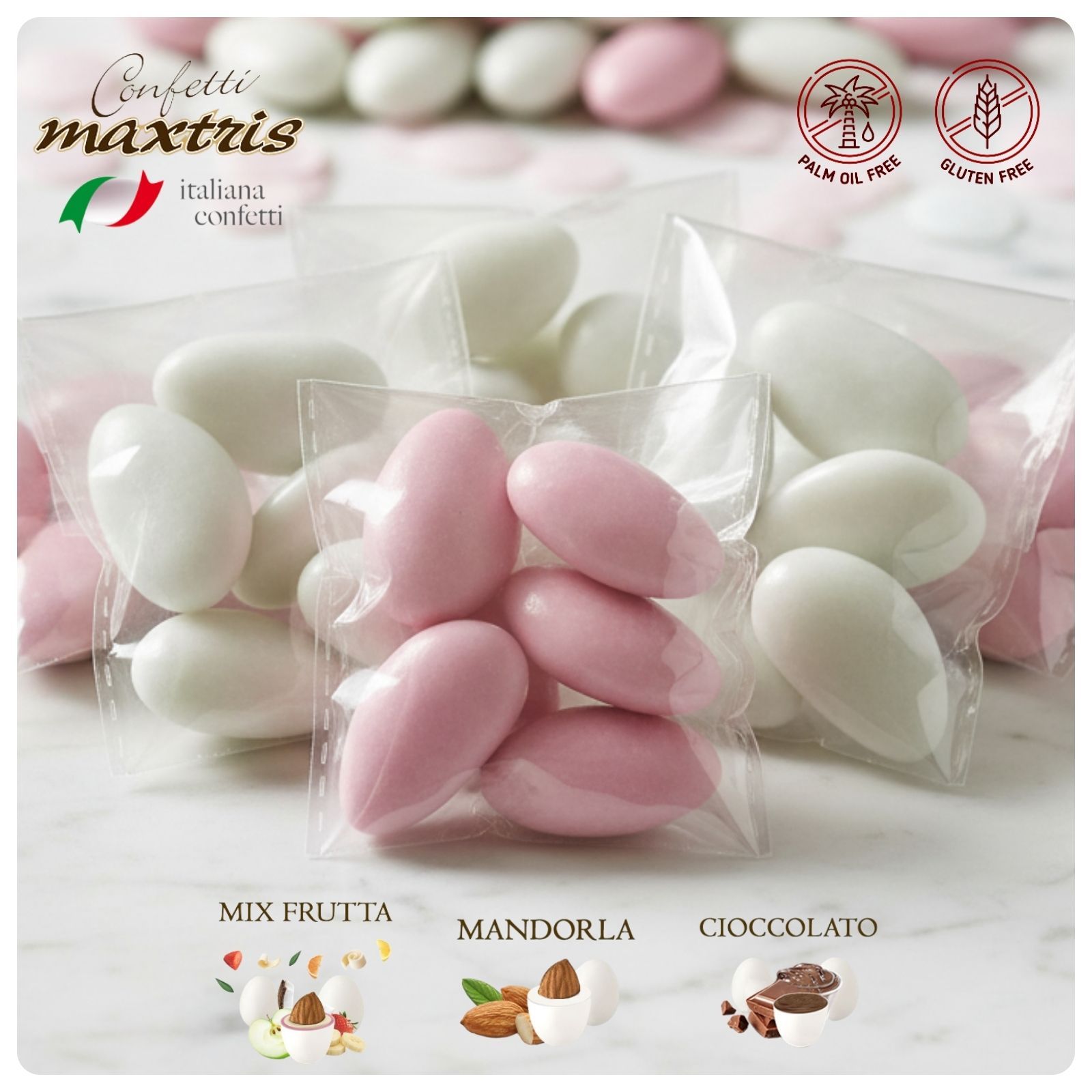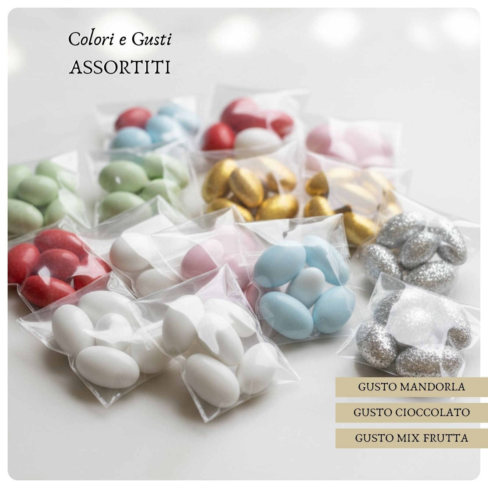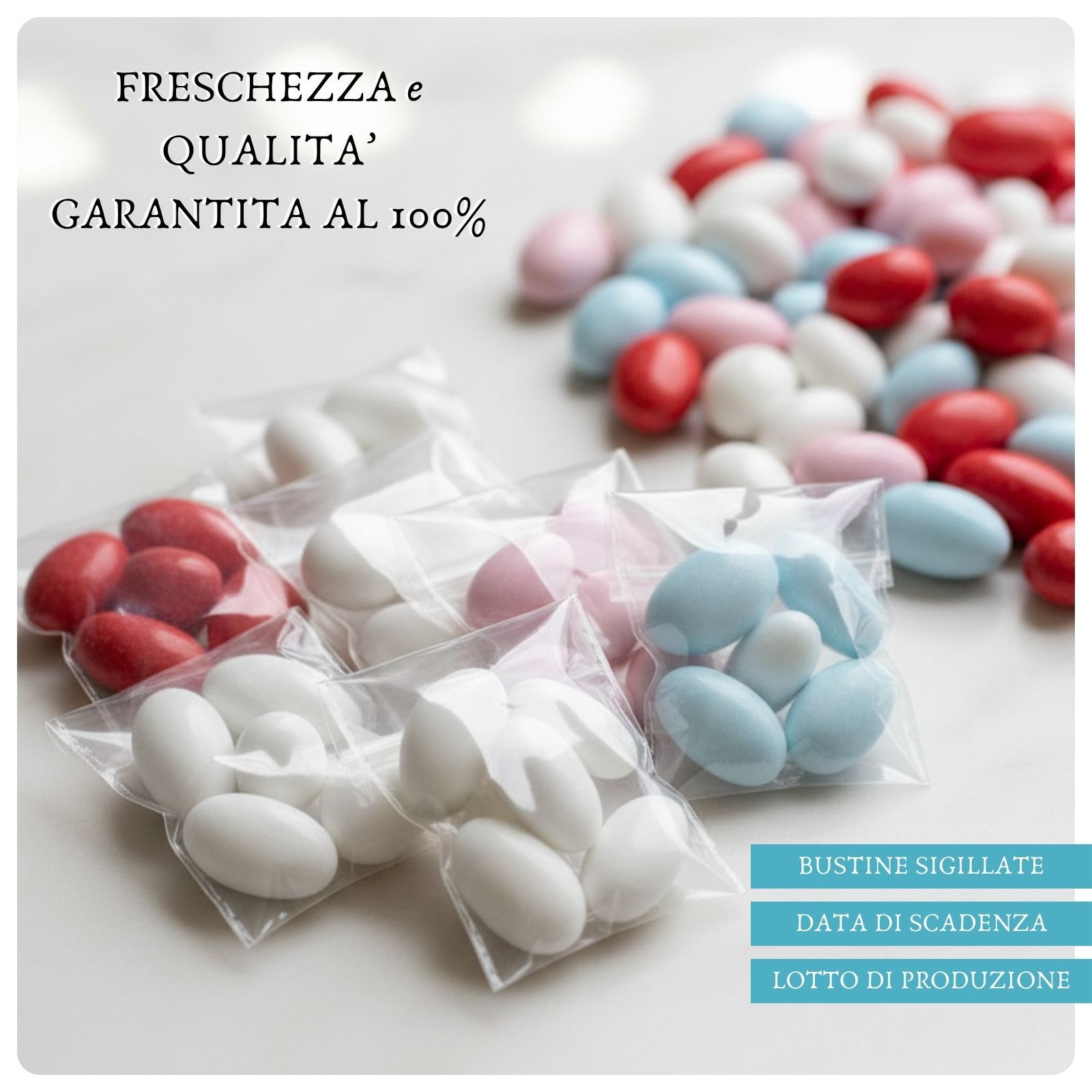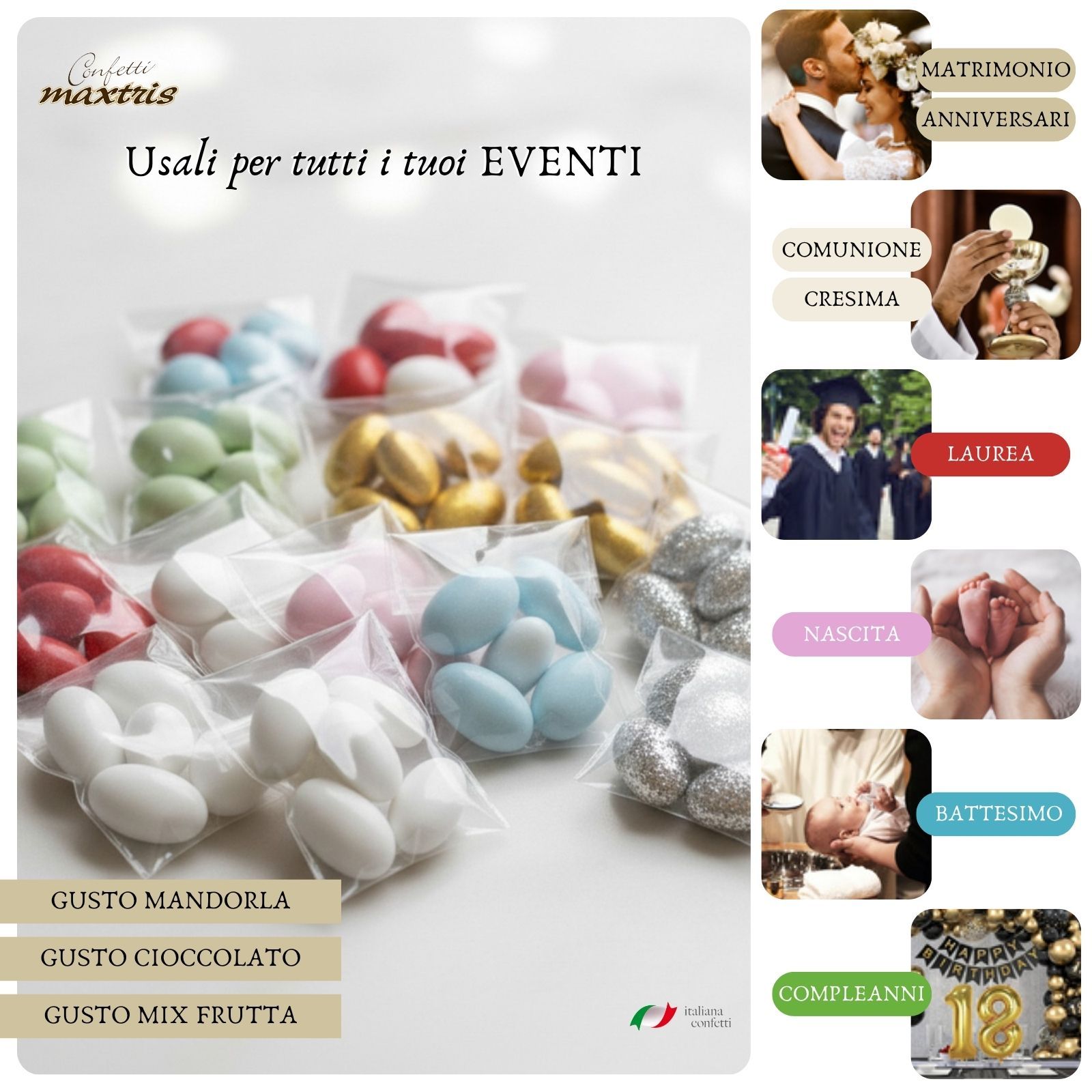Confetti imbustati a 5 al gusto mandorla o cioccolato del colore a tua scelta tra bianchi, rosa, celesti, rossi, verdi o misti. Adatti per ogni tipo di bomboniere o eventi come matrimonio, battesimo, laurea, nascita, compleanno, comunione, cresima, anniversario e tanto altro ad un prezzo in offerta ingrosso.