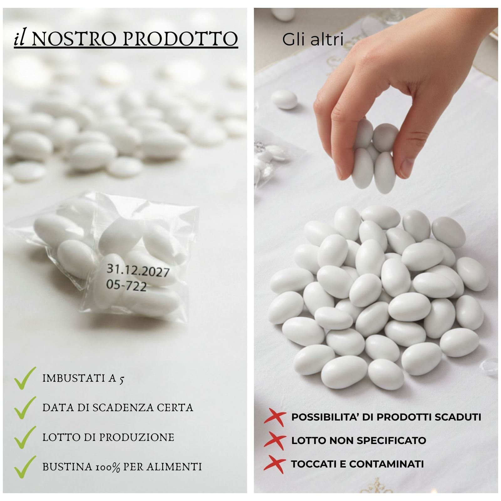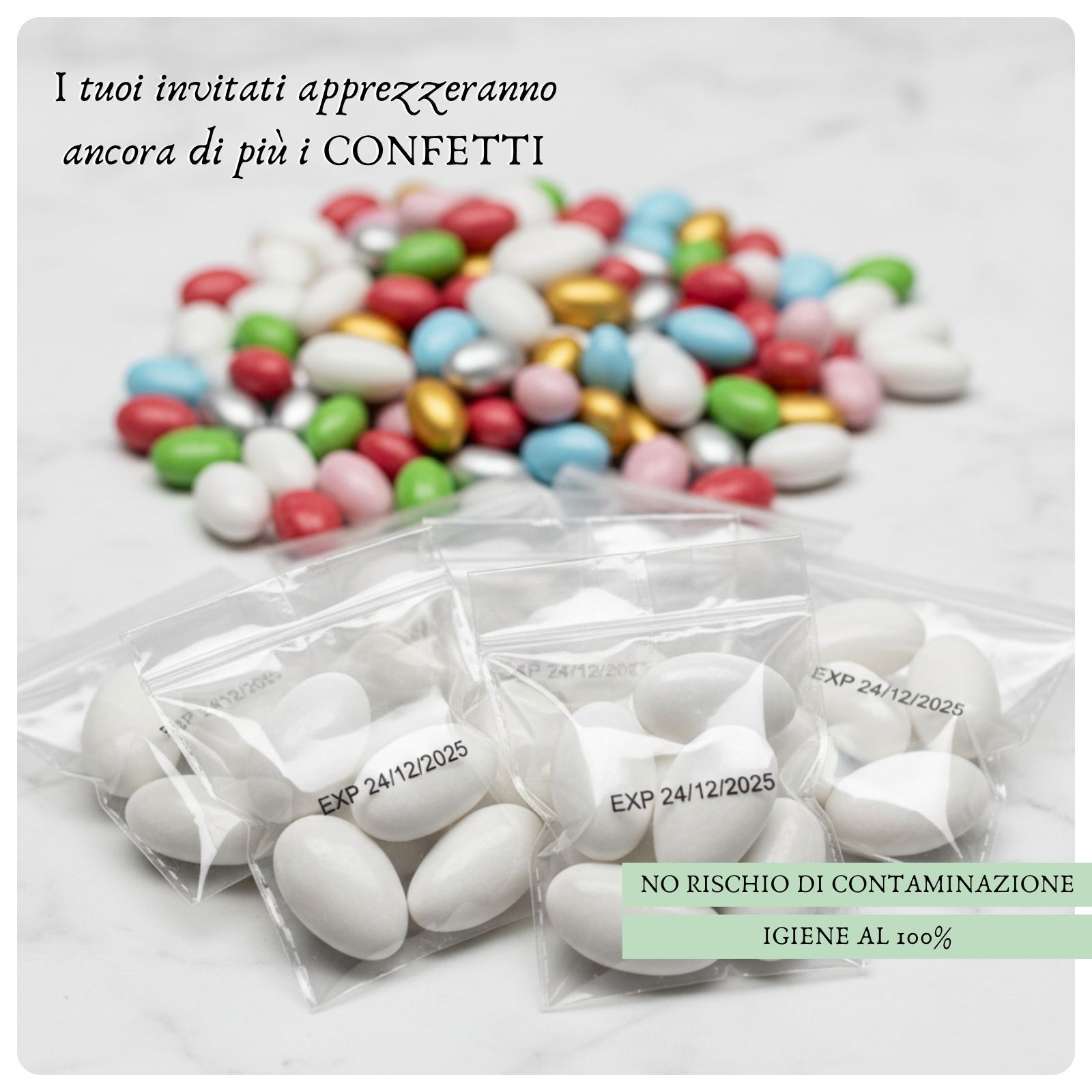 I confetti sono inseriti in bustine sigillate trasparenti sulle quali in filigrana è specificato il lotto e la data di scadenza che garantisce a lei e ai suoi invitati la qualità del confetto ricevuto e la tenuta igienica del confetto inbustato direttamente in fase di confezionamento dalla ditta produttrice.