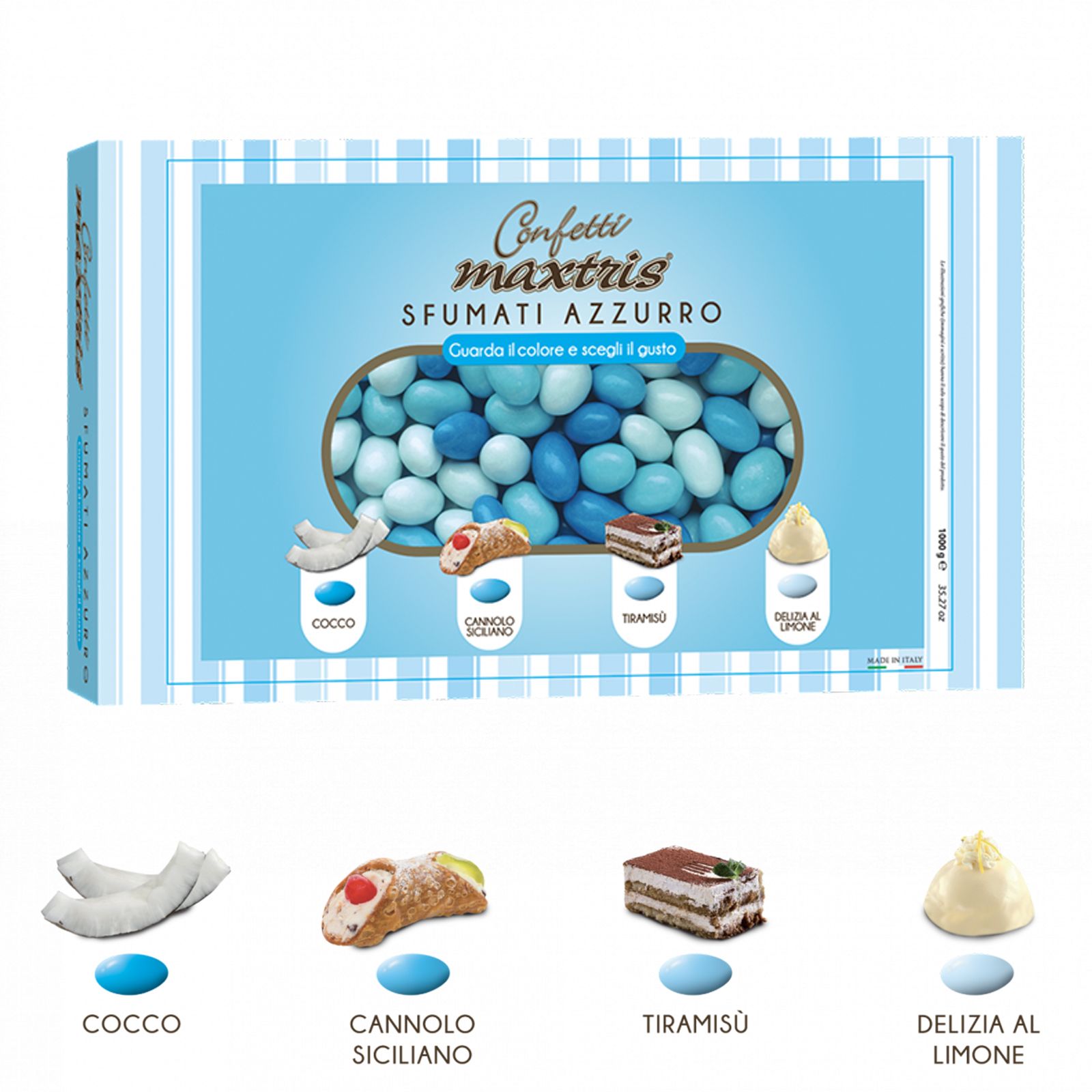 Disponibili per te le confezioni da 1 Kg di confetti sfumati nei toni del celeste con mandorla tostata ricoperta da uno strato di cioccolato bianco ai gusti assortiti: cocco, cannolo siciliano, tiramisù e delizia al limone e da un sottile strato di zucchero.