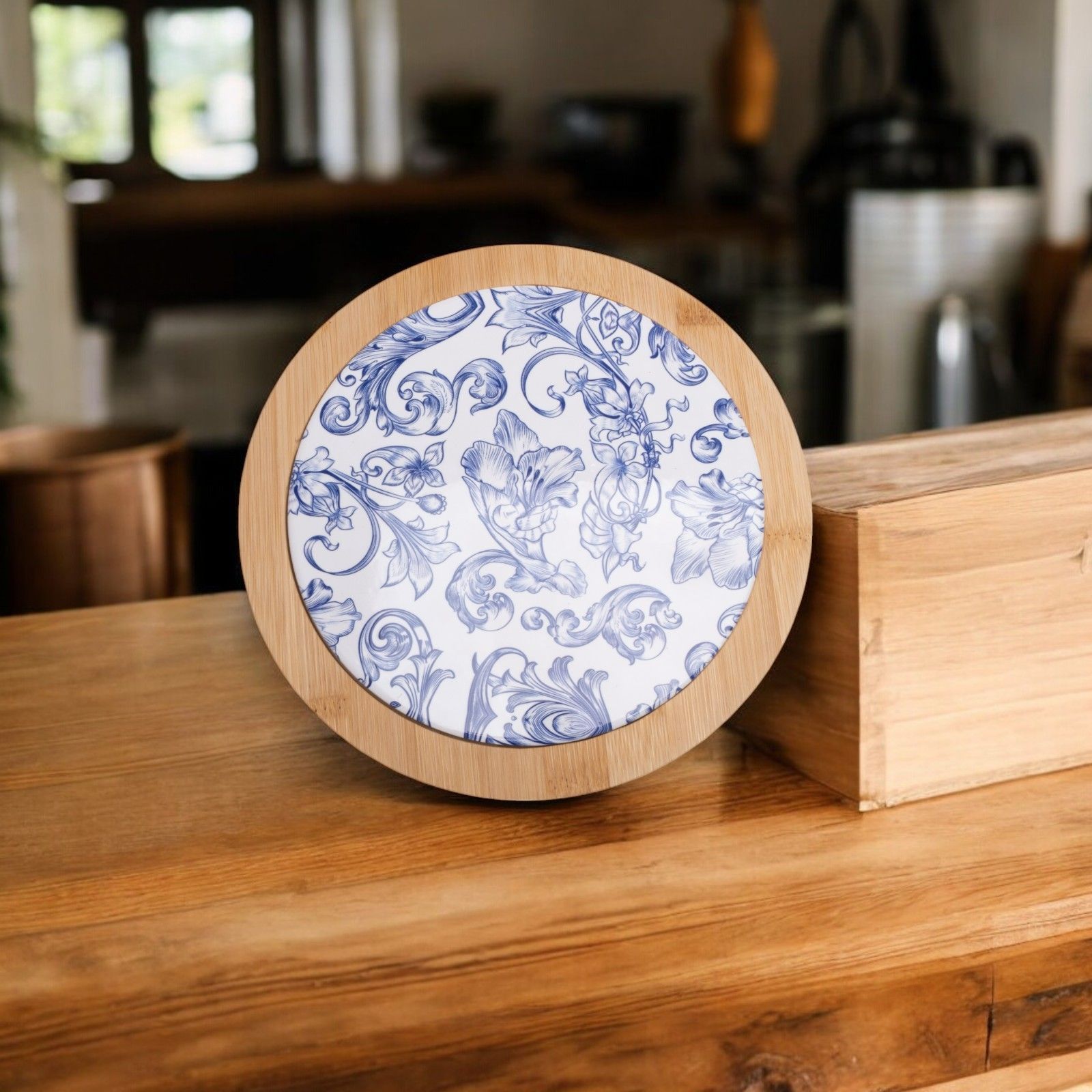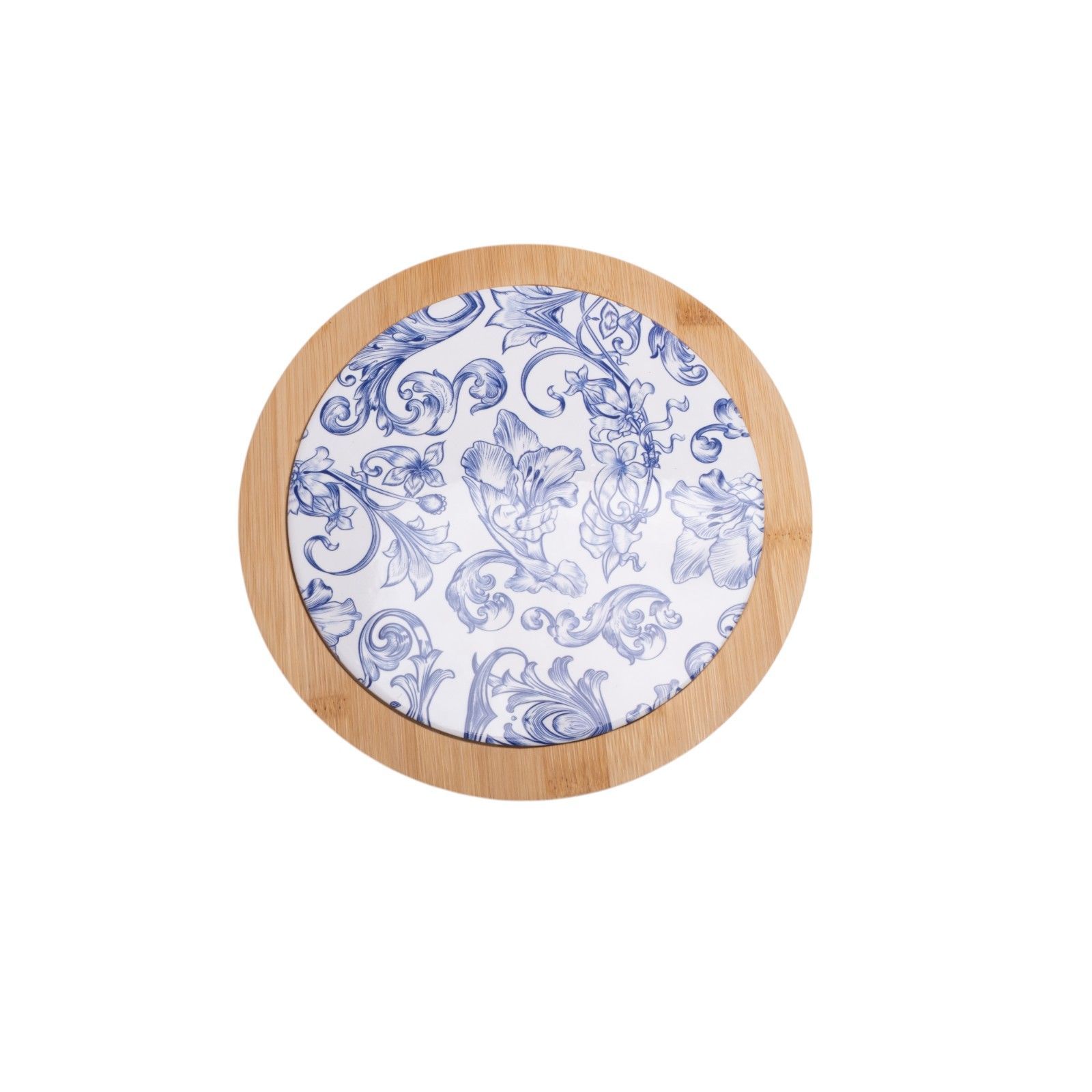 Le dimensioni dell'antipastiera sono di circa Ø22 cm e il colore è legno con una mattonella bianca e blu in ceramica. È un prodotto di alta qualità, ideale per chi cerca bomboniere originali e particolari per il proprio matrimonio.