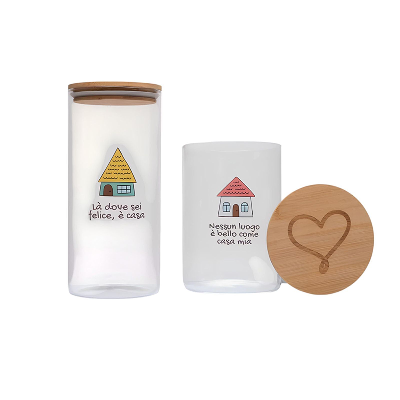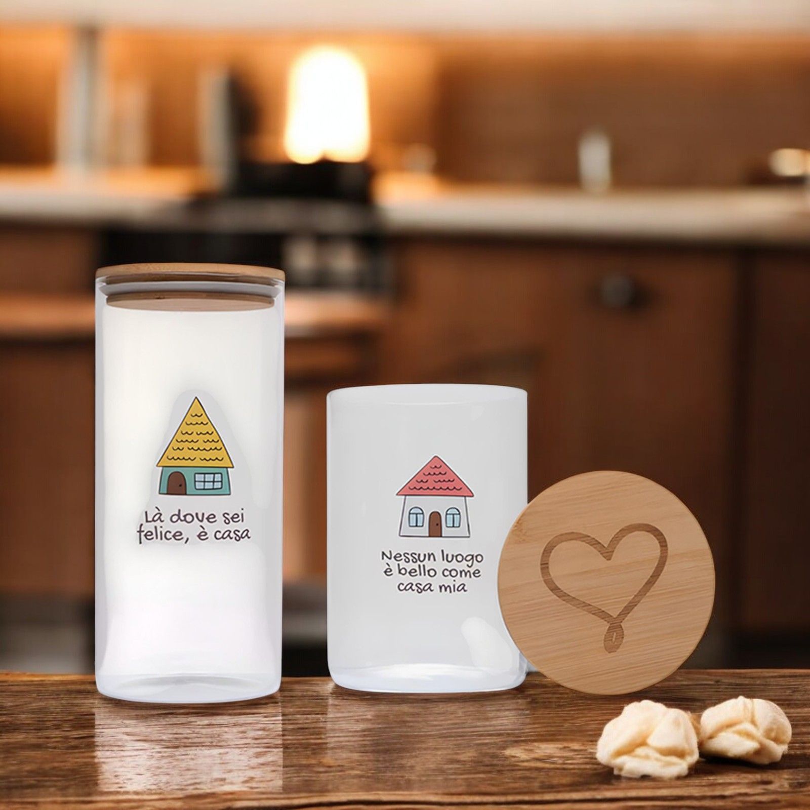 Questi simpatici barattoli cilindrici con disegno stilizzato casetta sono l'ideale per regalare un tocco di originalità e utilità ai tuoi ospiti. Con due frasi incise "Là dove sei felice sei a casa" e "Nessun luogo è bello come casa mia", questi barattoli sono perfetti per eventi come Matrimoni, Anniversari e Comunioni.