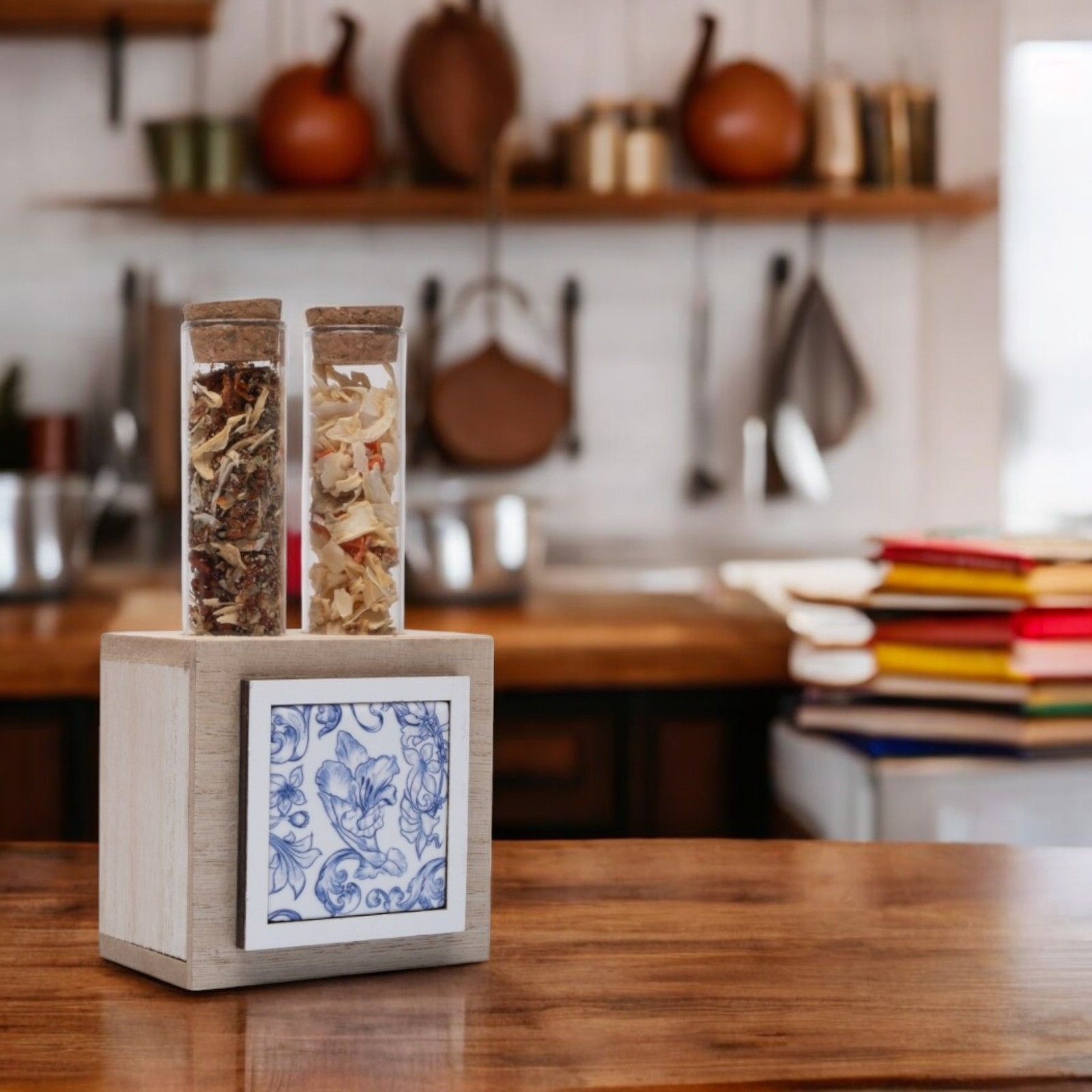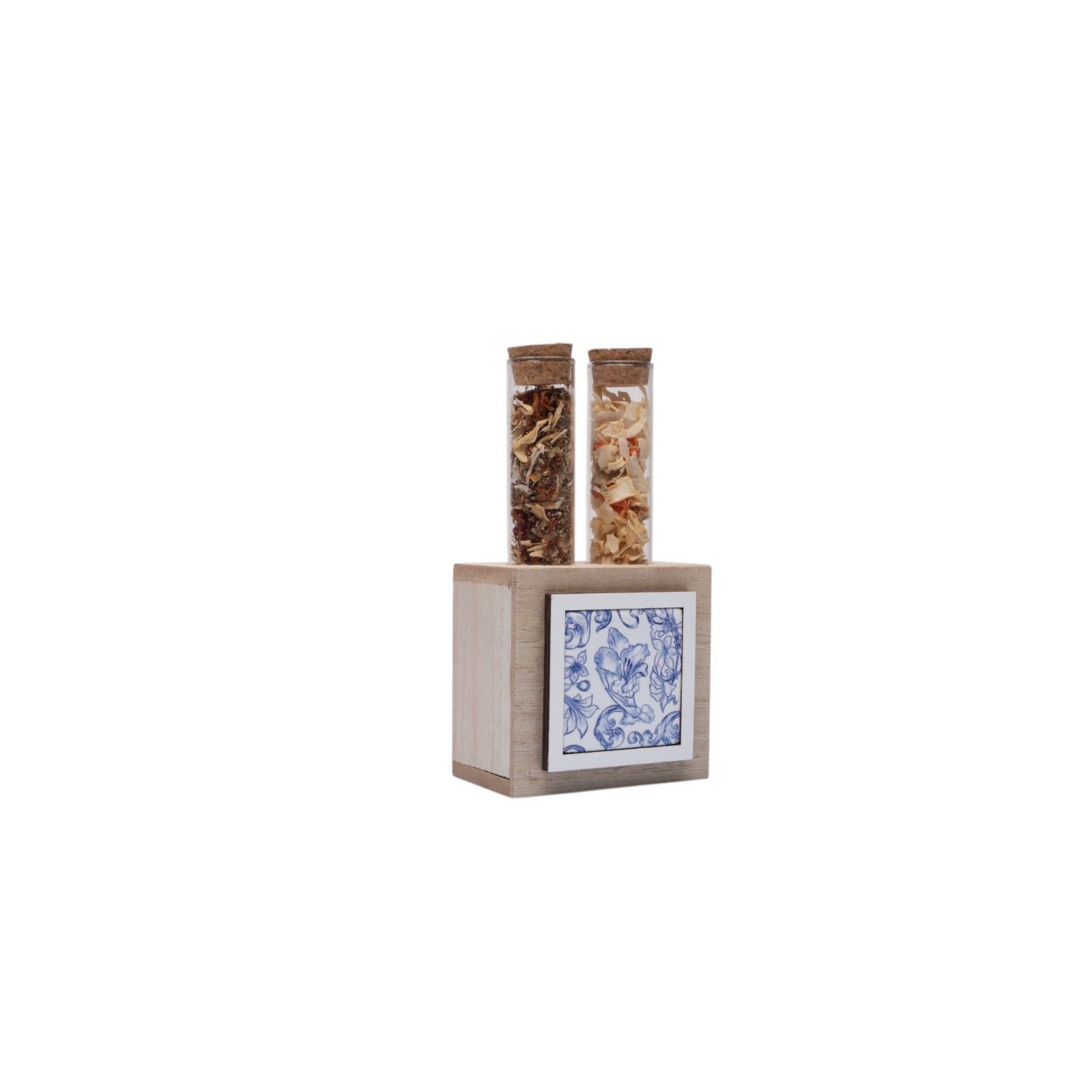 Bomboniera solidale Portaspezie con fregio e 2 flaconi con spezie casuali: per frittata/pizzaiola/per spaghetti aglio, olio e peperoncino.