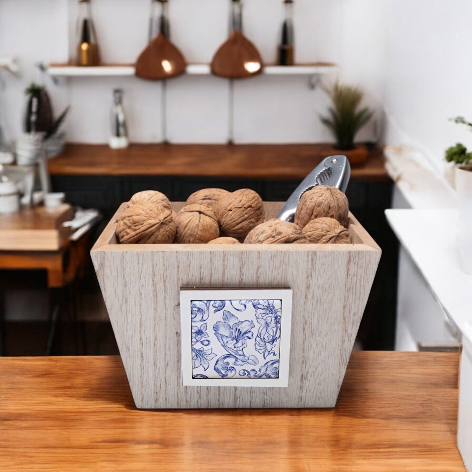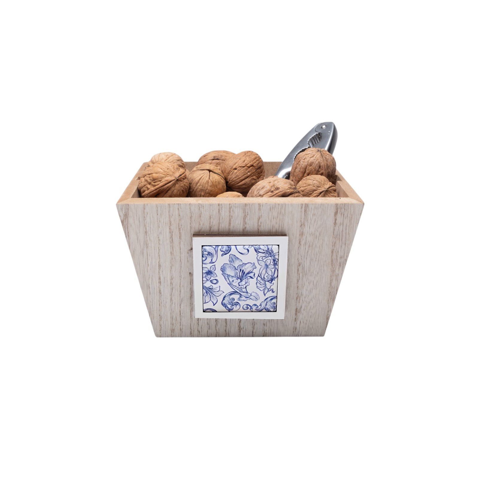 Il vassoio schiaccianoci con applicazione sul davanti di una decorazione è un'idea originale e particolare per bomboniere matrimonio, anniversario o comunione. Realizzato in legno e ceramica, questo vassoio di dimensioni cm 16x16x10 è caratterizzato da un elegante colore legno con fregio bianco e blu.