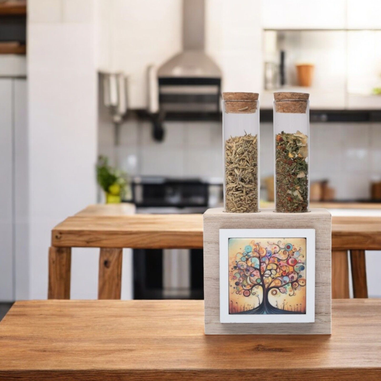 Portaspezie con albero della vita colorato e 2 flaconi con spezie casuali è la bomboniera perfetta per rendere speciale il tuo matrimonio o anniversario. Realizzata in legno e ceramica, ha dimensioni di 8.5 x 5 x 16H cm circa e si presenta nei colori pastello della collezione solidale Cuorematto.