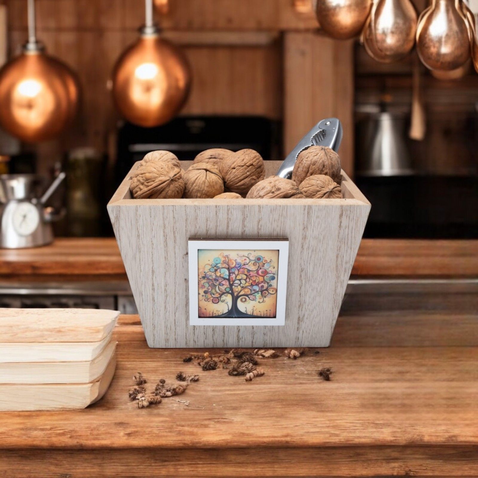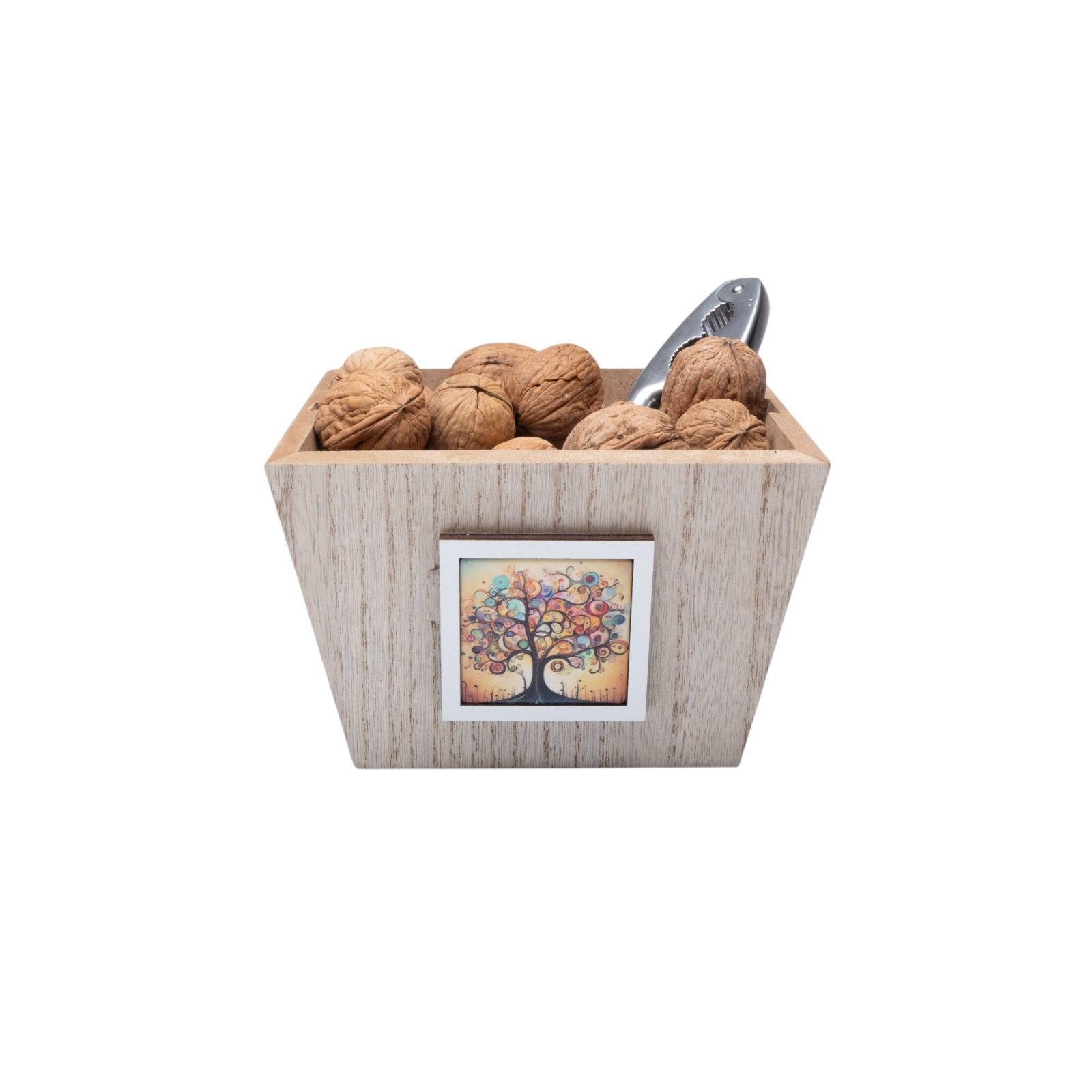 La raffigurazione dell'albero della vita colorato simboleggia la rinascita e la crescita, rendendo questa bomboniera un regalo significativo per i tuoi cari. Il vassoio schiaccianoci è disponibile nei colori legno e pastello.
