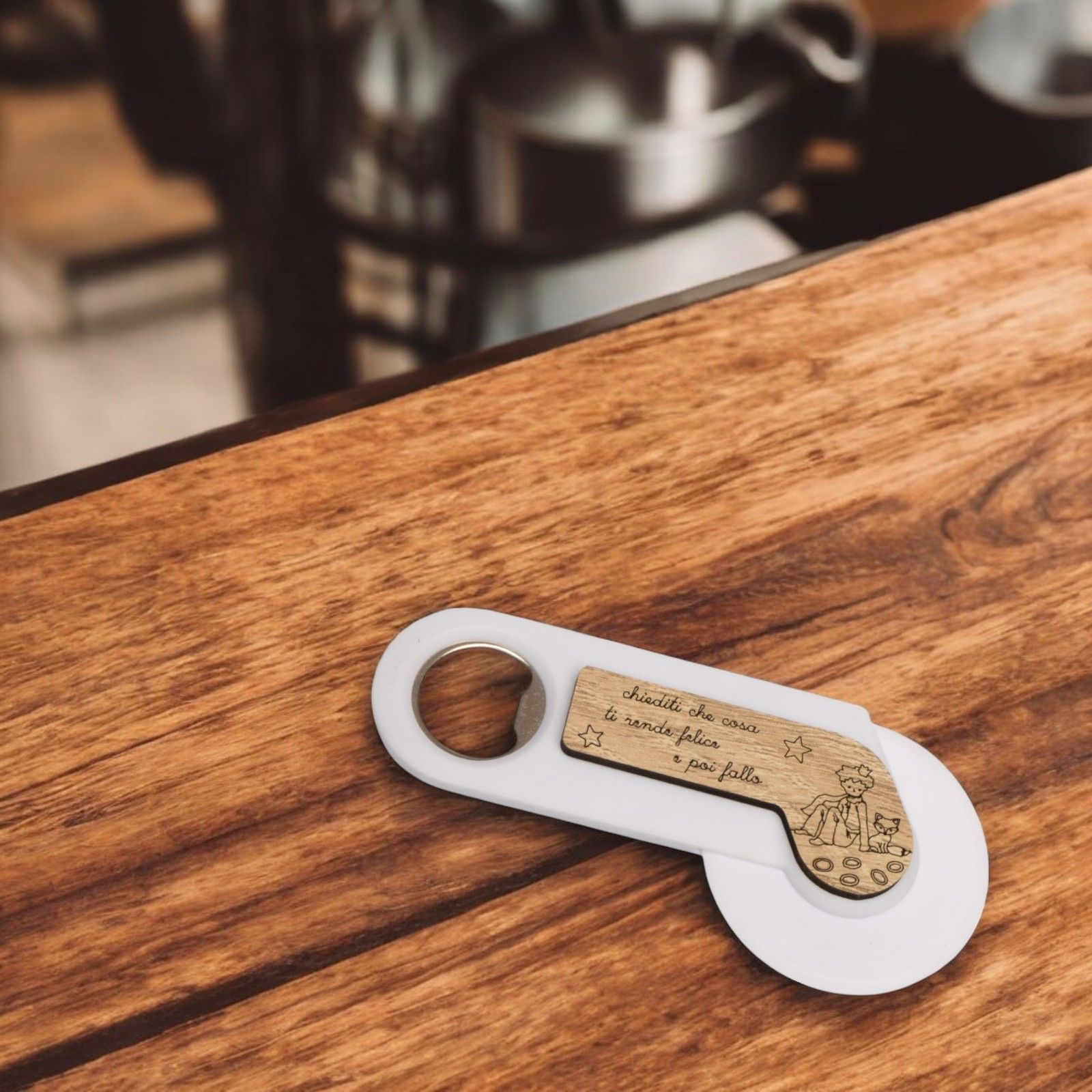 Tagliapizza e apribottiglie 2-in-1 con la dolce raffigurazione del Piccolo Principe e della sua fidata volpe, accompagnati dalla frase motivazionale: "Chiediti cosa ti rende felice e poi fallo". Un oggetto che unisce design, funzionalità e un messaggio significativo.