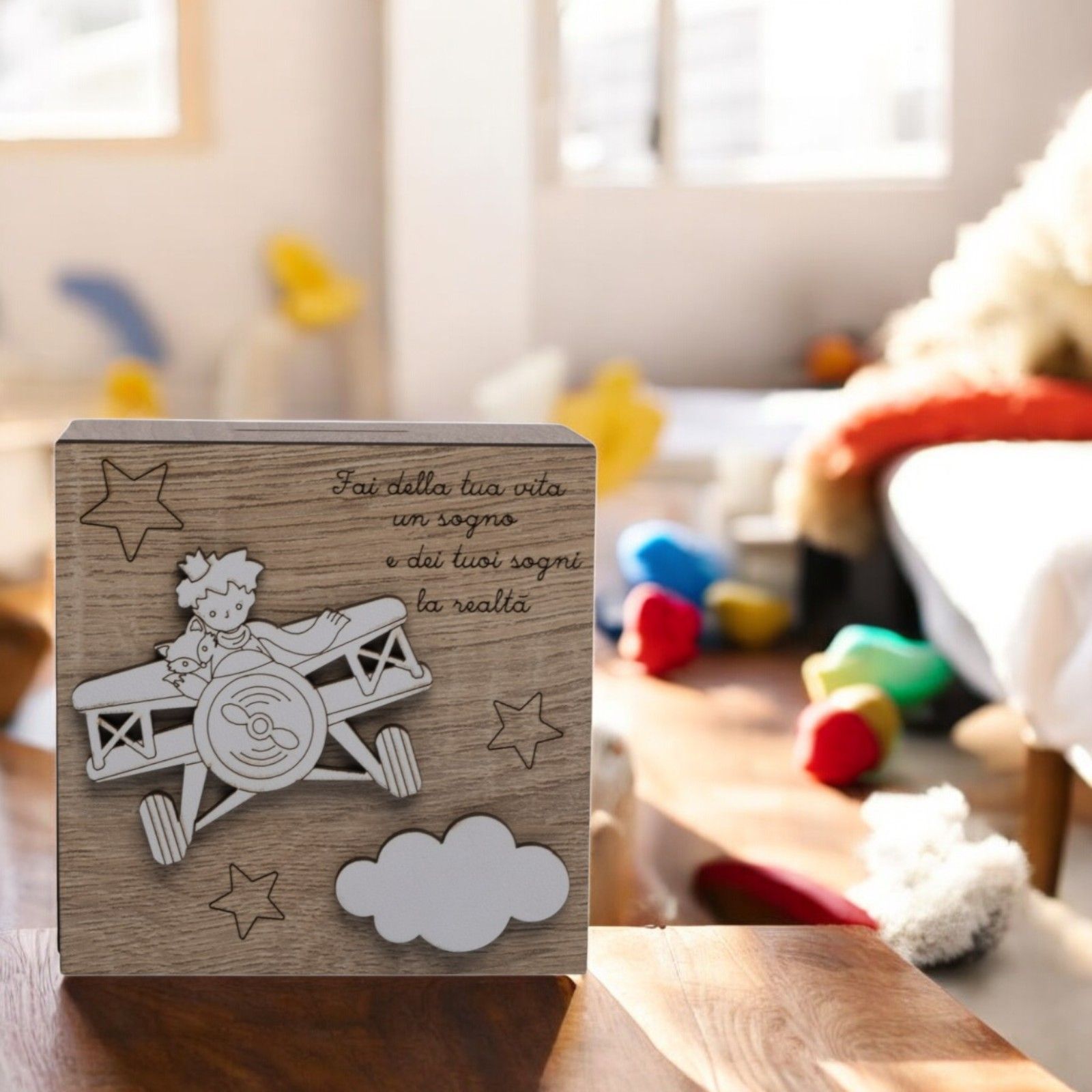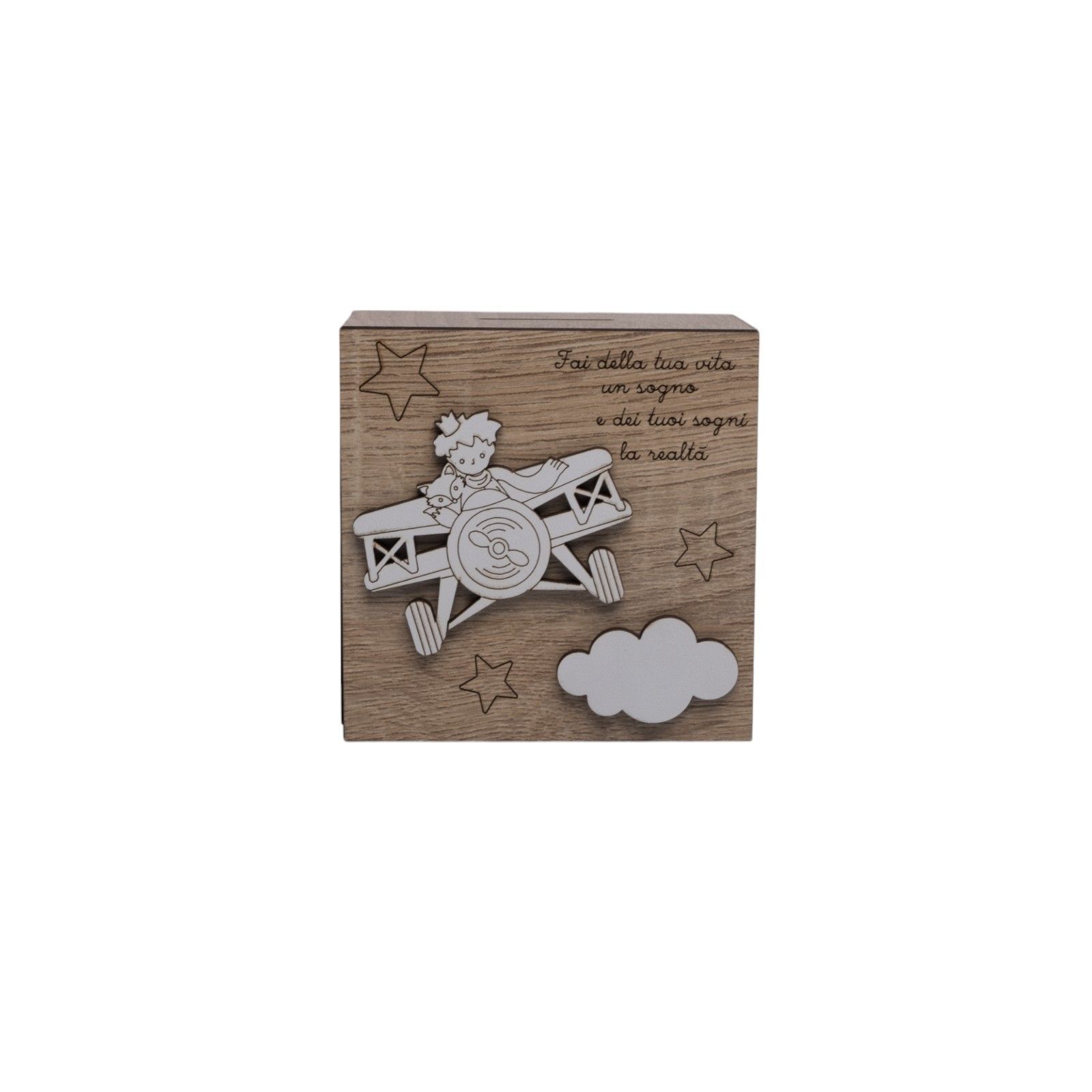 Salvadanaio a forma di scatola in legno, con la dolce raffigurazione del Piccolo Principe e della sua amica volpe su un aereo, circondati da stelline e una nuvola. Un'idea regalo particolare e originale, perfetta per battesimi, comunioni e primi compleanni.