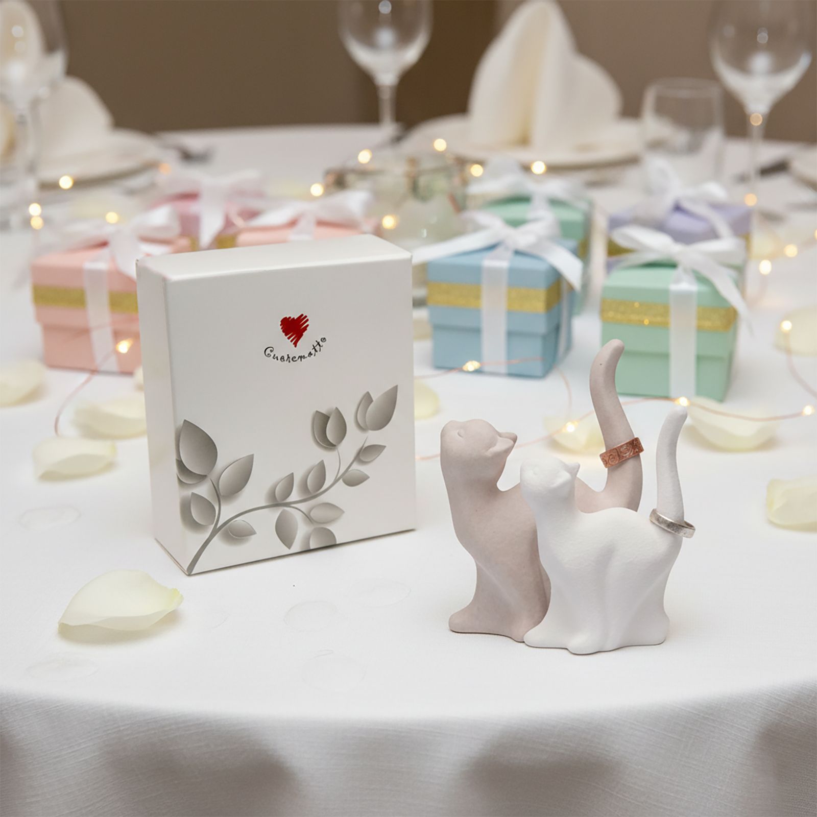 Scopri la magia del nostro porta anelli con due gattini, un'idea regalo originale che trasmette amore e dolcezza in ogni occasione speciale. Perfetto per battesimi, comunioni e matrimoni, questo accessorio in ceramica è molto più di una semplice bomboniera; è un simbolo di un legame unico, un ricordo da custodire nel tempo. I due gattini, delicatamente assortiti nei toni del bianco e del tortora, aggiungono un tocco di tenerezza e stile al tuo evento, rendendo ogni momento indimenticabile.