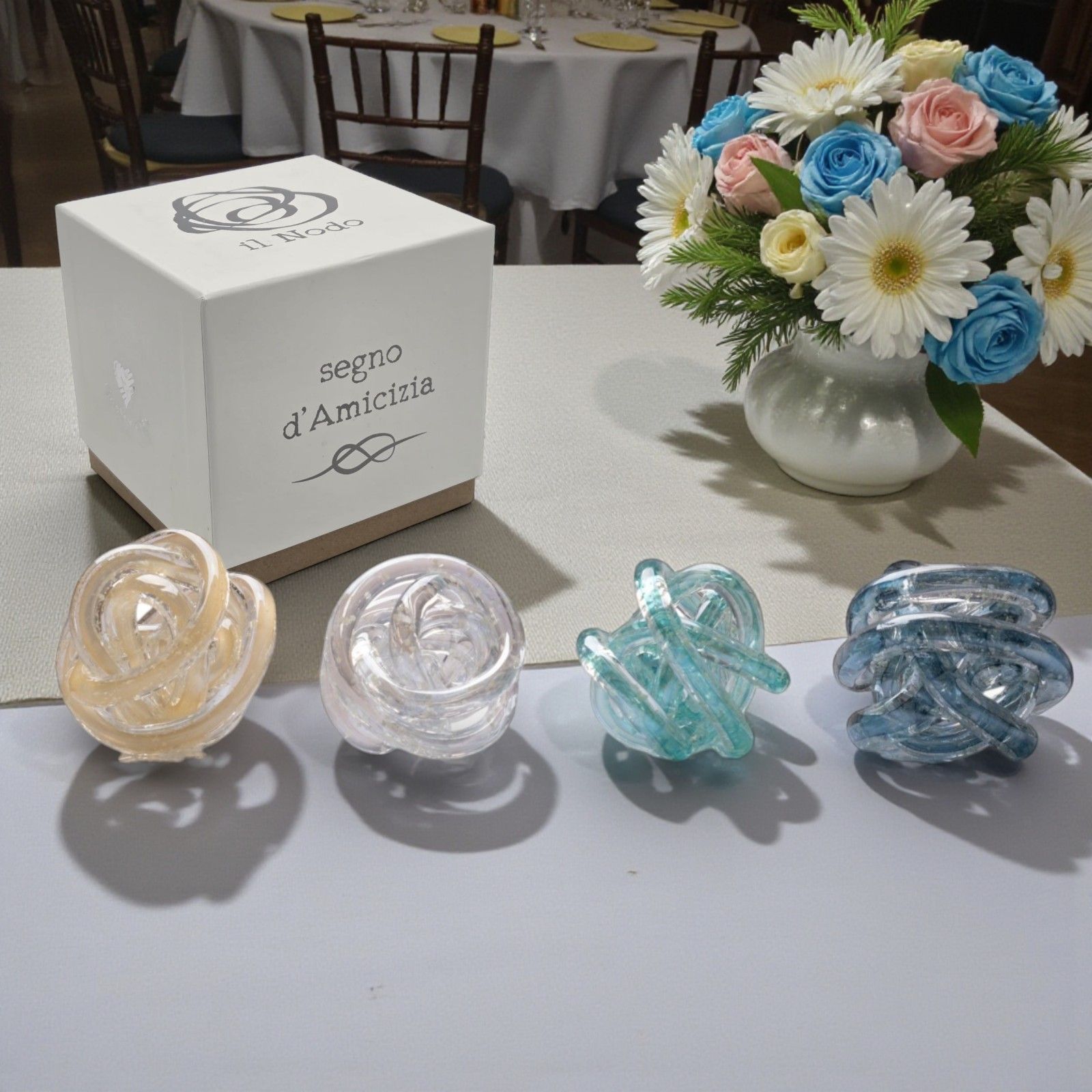 I Nodi d'Amore rappresentano un gesto d'affetto unico, perfetto per celebrare eventi indimenticabili come il tuo matrimonio o un anniversario. Ogni bomboniera è realizzata in vetro fatto a mano, rendendo ogni pezzo unico e speciale. Scegliere queste bomboniere solidali, assortite in 4 colori, non è solo una scelta estetica, ma un modo per trasmettere un messaggio profondo di amore e solidarietà.