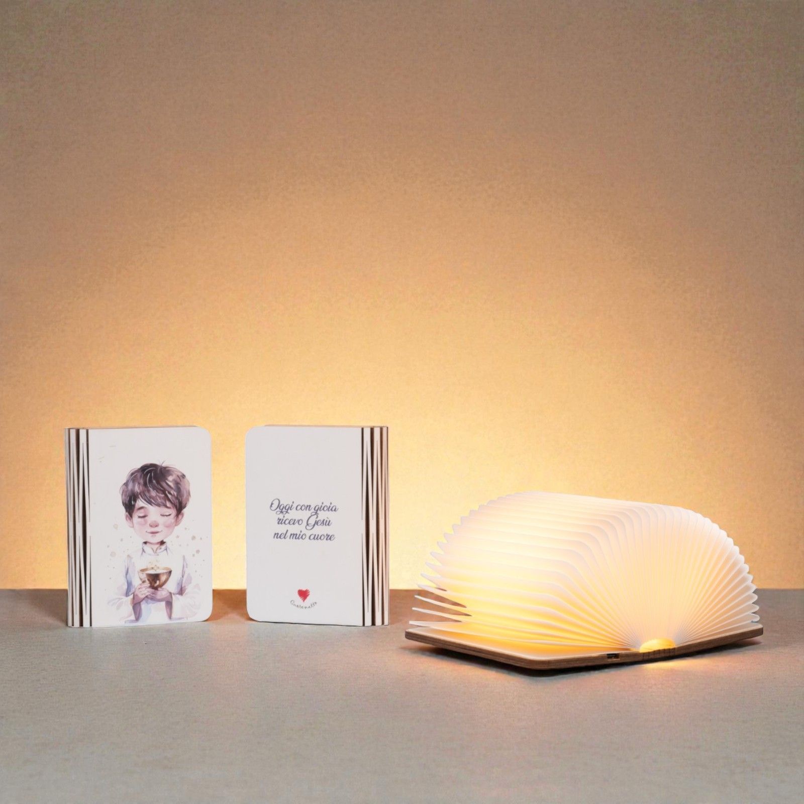 Scopri il nostro Libro Luminoso, un'affascinante bomboniera pensata per rendere indimenticabile il giorno della prima comunione. Raffigurante un bimbo in abiti eleganti con un calice in mano, questo oggetto non è solo un regalo ma un simbolo di fede e gioia. La dolce scritta sul retro "Oggi con gioia ricevo Gesù nel mio cuore" trasmette un messaggio profondo, perfetto per celebrare un momento così speciale nella vita di ogni bambino.