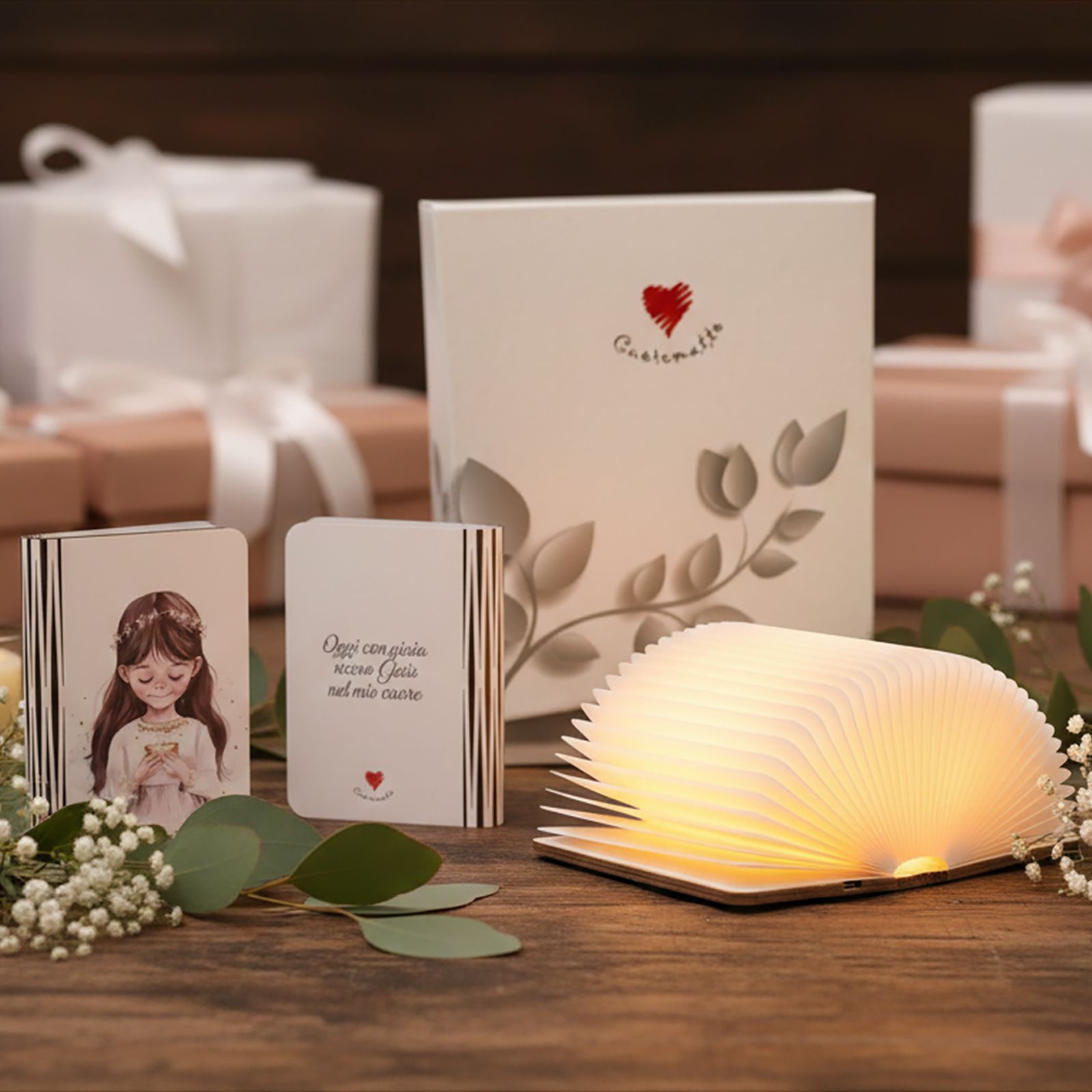 Il nostro Libro Luminoso con la dolce bimba in abiti eleganti è molto più di una semplice bomboniera; è un simbolo di amore e gioia per la tua prima comunione. La scritta sul retro, "Oggi con gioia ricevo Gesù nel mio cuore", rappresenta un momento unico e indimenticabile, un ricordo che accompagnerà per sempre la tua piccola in questo giorno speciale.