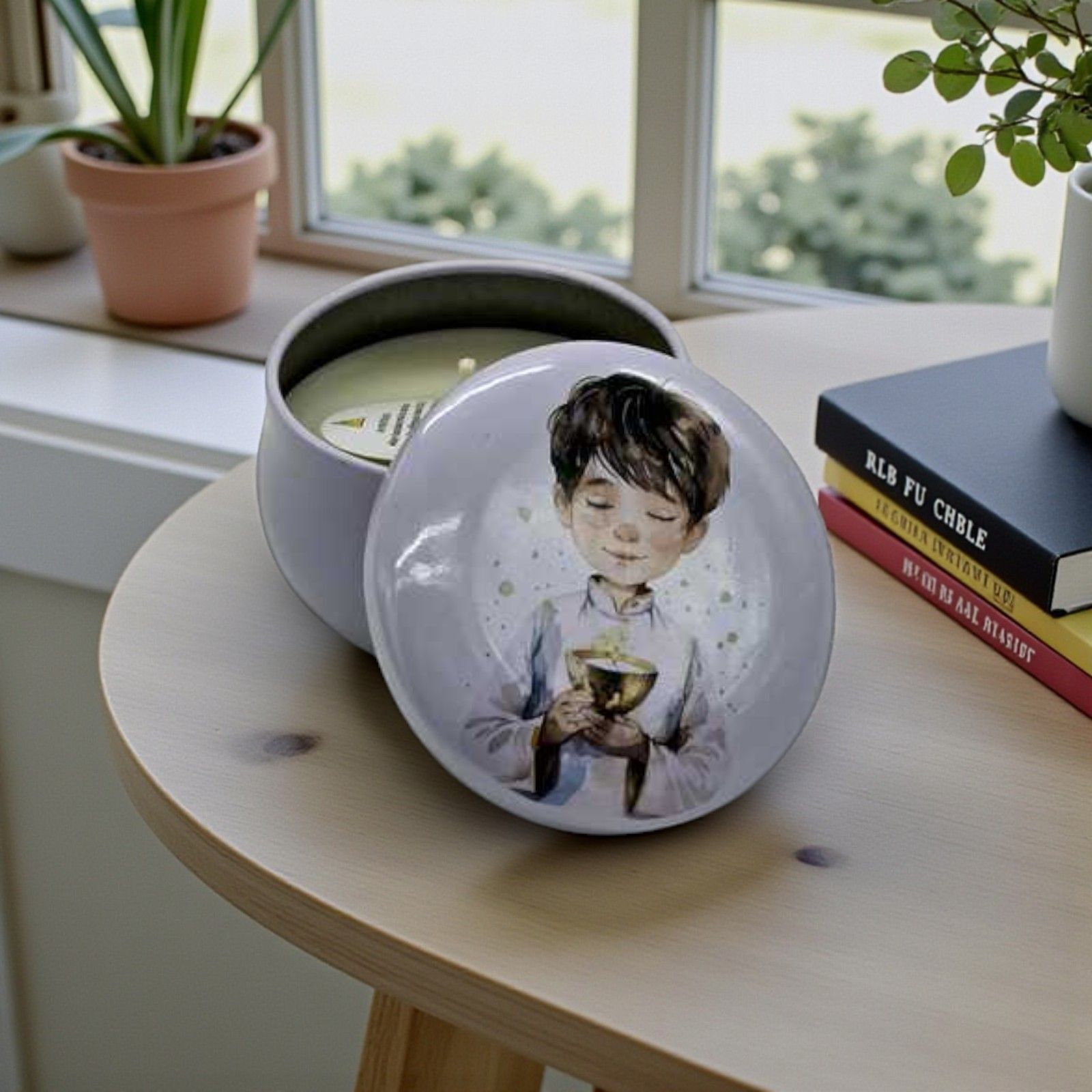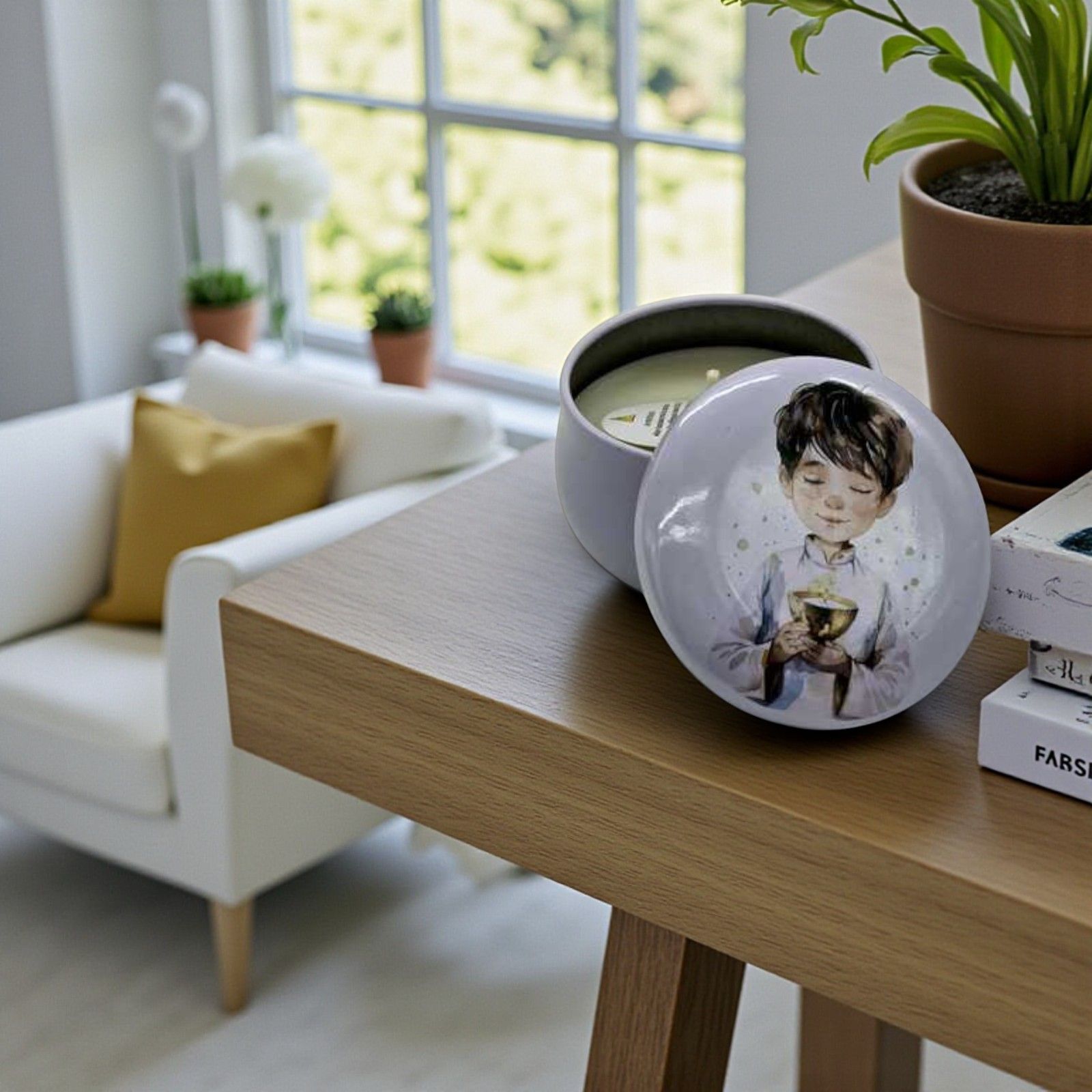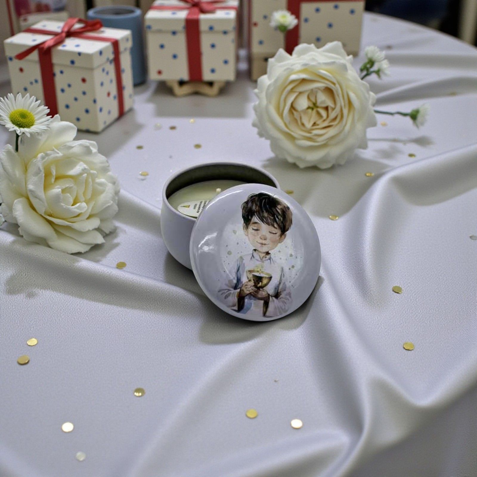 Celebra la prima comunione con un gesto di dolcezza e significato grazie a questa candela in contenitore in latta raffigurante un bimbo con il calice tra le mani. Una bomboniera delicata e simbolica, pensata per sorprendere e emozionare gli invitati durante un giorno speciale.